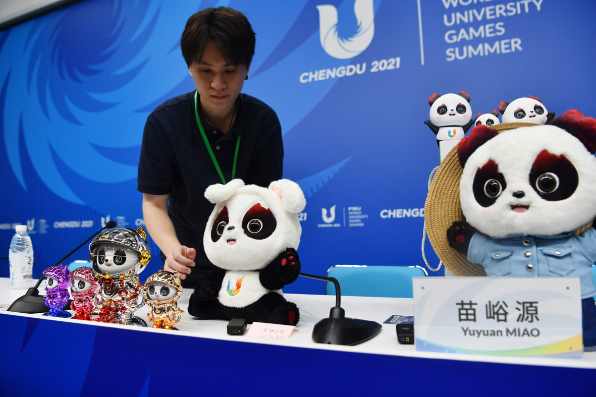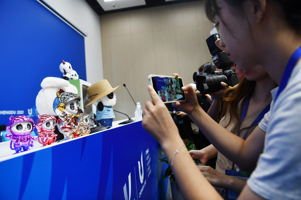 7月10日,四川成都,成都大运会“蓉宝”主题特许商品吸引媒体拍摄。目前,成都大运会围绕吉祥物“蓉宝”主题,累计推出玩具类、徽章类、文具类、邮票邮品类等18大系列1000余款特许商品。(图片来源:中新社)