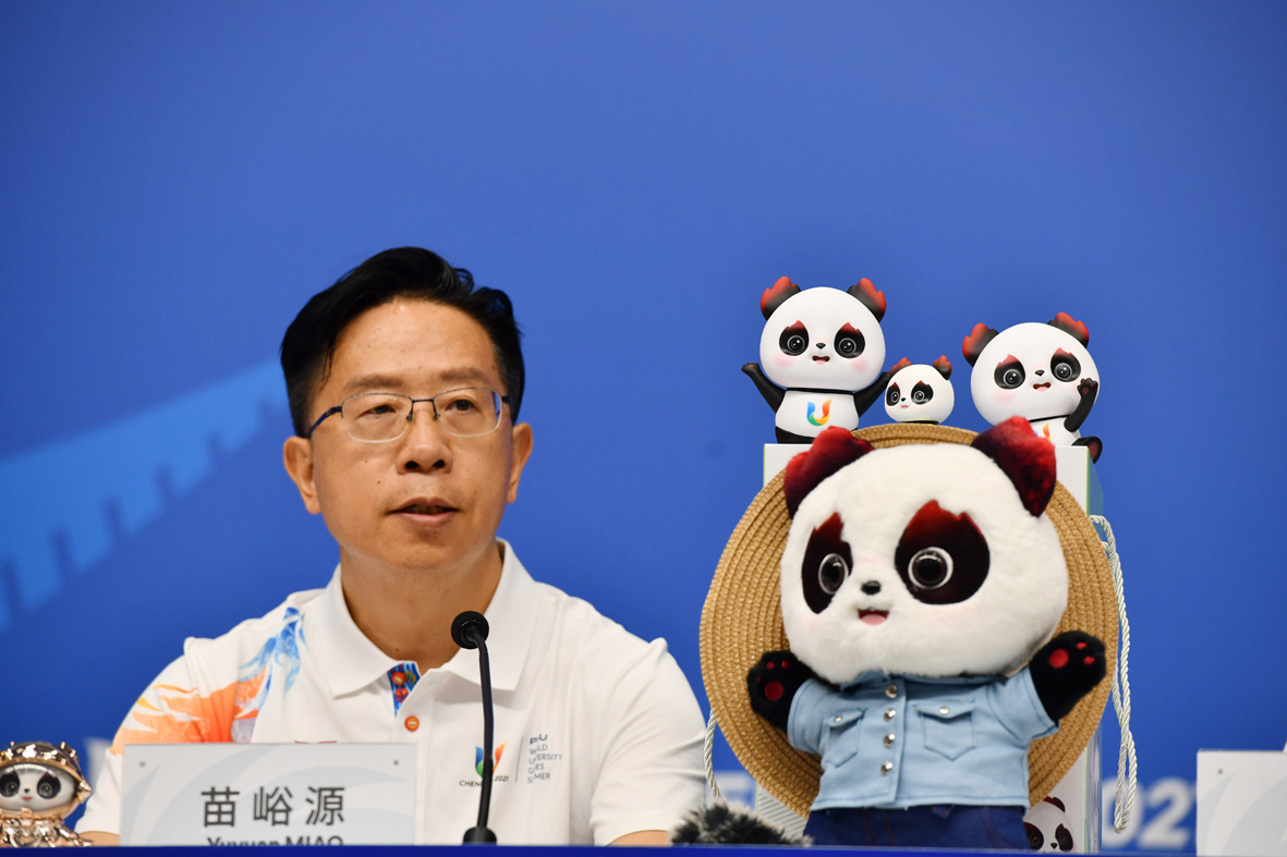 7月10日,四川成都,成都大运会宣传部(开闭幕式部)党组成员、专职副部长苗峪源在发布会上介绍成都大运会“蓉宝”主题特许商品。目前,成都大运会围绕吉祥物“蓉宝”主题,累计推出玩具类、徽章类、文具类、邮票邮品类等18大系列1000余款特许商品。(图片来源:中新社)