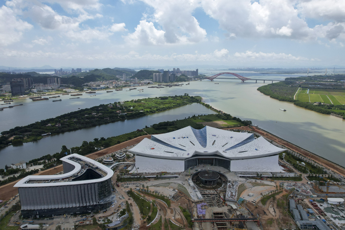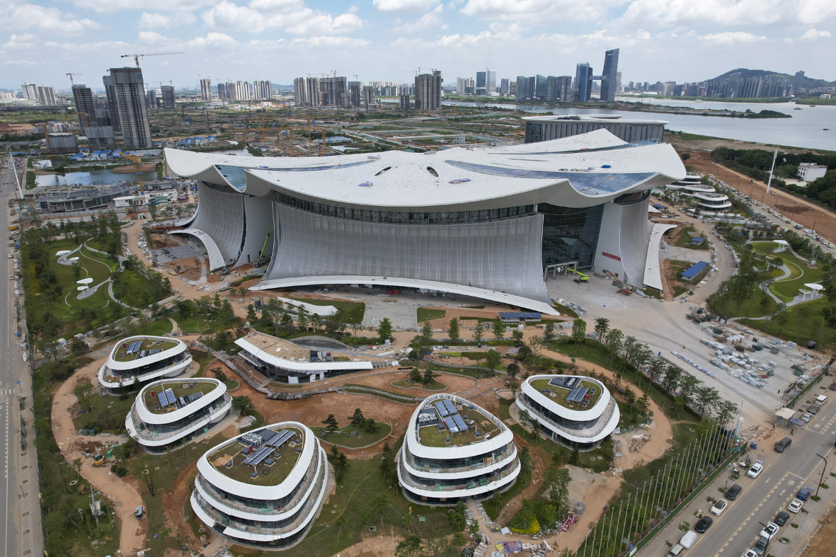 7月11日,航拍南沙国际金融论坛(IFF)永久会址项目的国际会议中心。该项目位于广东省广州市南沙区的横沥岛尖东侧,以“木棉花开 鸿翔海丝”为设计理念,主要包含国际会议中心、国际会议服务中心、国际会议服务中心配套用房及公共服务用房三个部分,总用地面积约20.35万平方米,总建筑面积约24.84万平方米。(无人机照片)(图片来源:中新社)