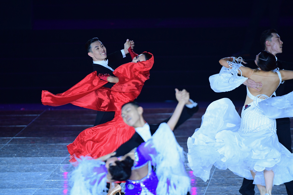 7月13日晚,广东省深圳市,2023第十八届世界杯国际标准舞公开赛在深圳会展中心举行。图为选手在摩登舞比赛中。 (图片来源:中新社)