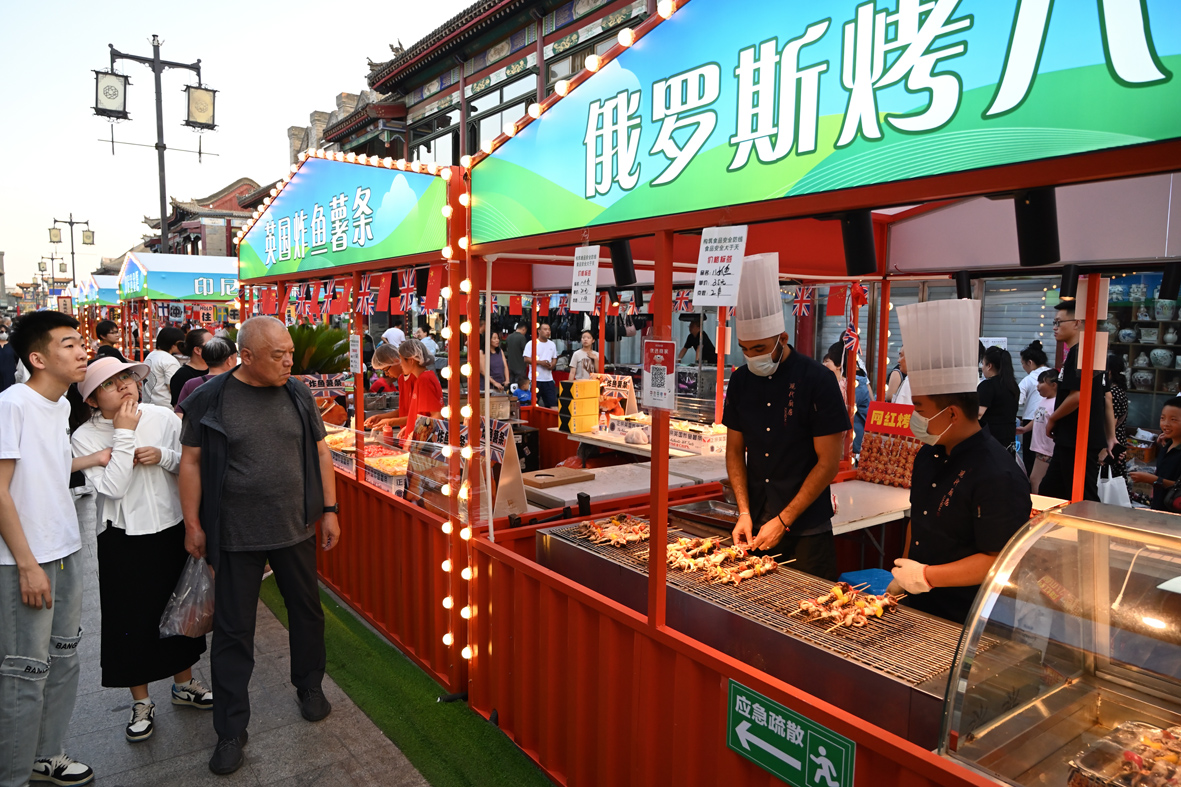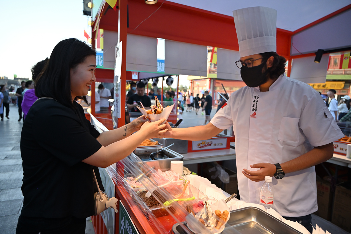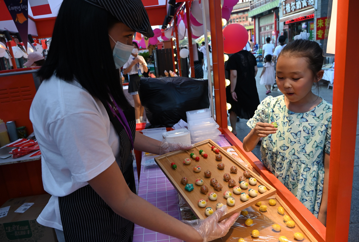 7月17日,内蒙古呼和浩特市,游客品尝西班牙拉丁果。近日,第九届中俄蒙国际美食文化节在内蒙古呼和浩特市启幕,作为活动项目之一的“中俄蒙特色小吃嘉年华”也在同期亮相,多国美食吸引民众品尝。(图片来源:中新社)