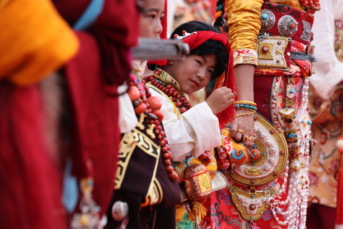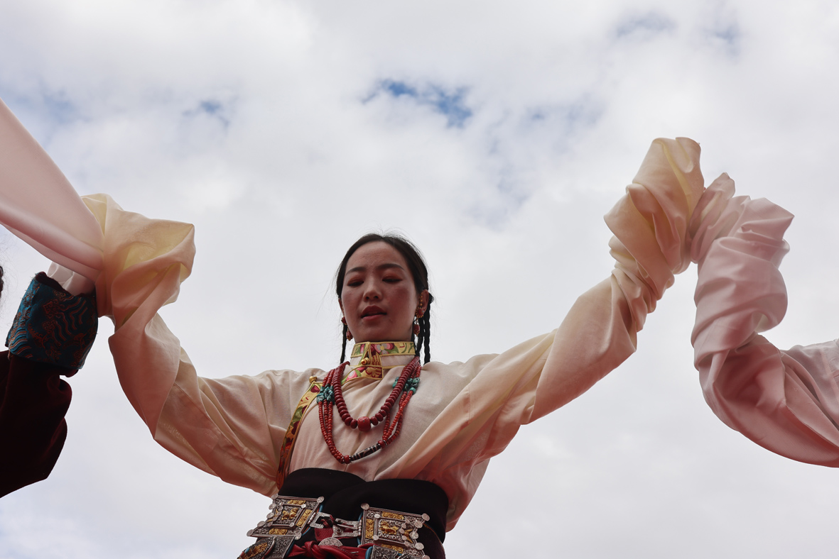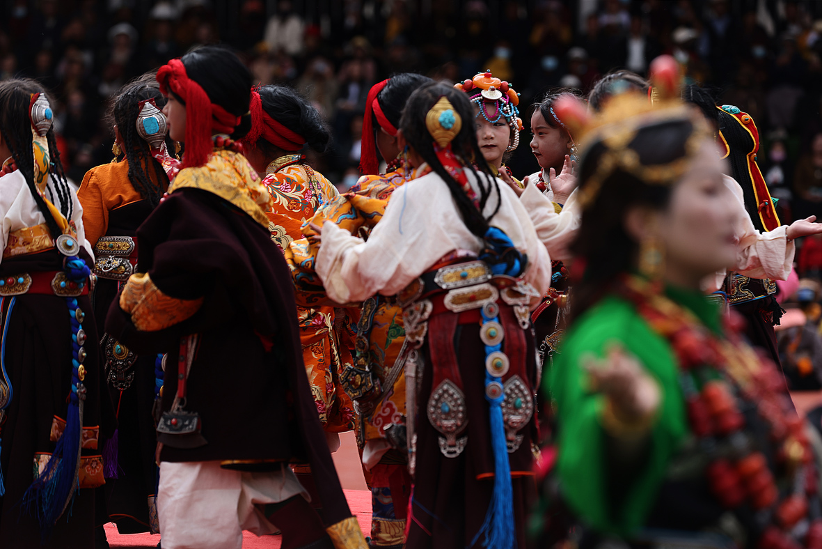 7月17日,西藏自治区昌都市贡觉县,民众身着极具特色的民族服装服饰,载歌载舞出席当地的特色服饰展活动。(图片来源:中新社)