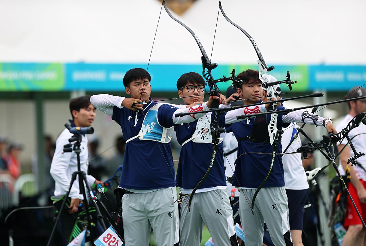 三名中国射箭队选手在男子反曲弓团体淘汰赛比赛中。(图片来源:中新社)
