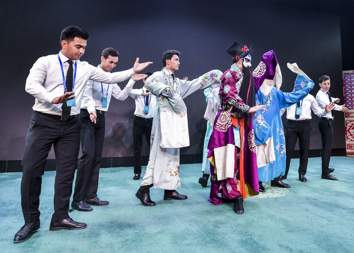 8月2日,新疆乌鲁木齐京剧院,土库曼斯坦国家舞蹈团演员跟随京剧演员学习戏曲动作。当天,前来参加第六届中国新疆国际民族舞蹈节的土库曼斯坦国家舞蹈团前往乌鲁木齐京剧院开展文化交流活动。(图片来源:中新社)