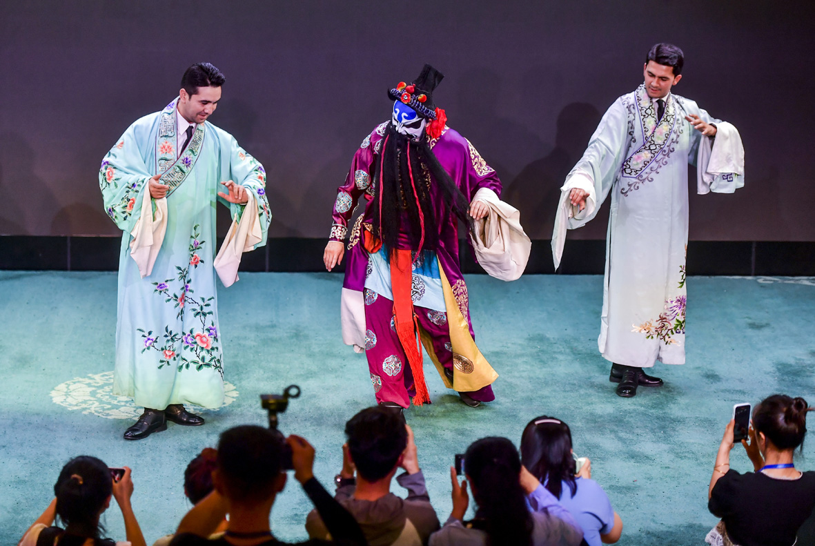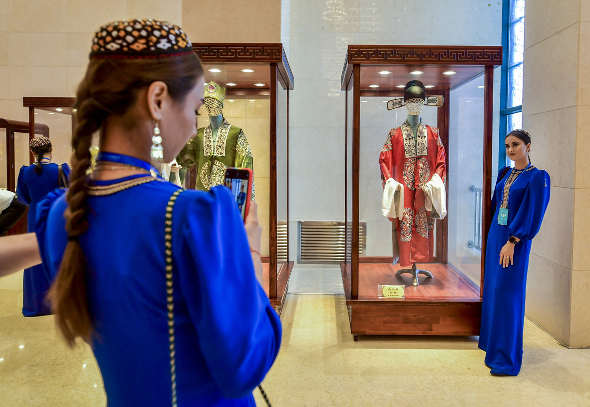 8月2日,新疆乌鲁木齐京剧院,土库曼斯坦国家舞蹈团演员参观京剧文化展览区。当天,前来参加第六届中国新疆国际民族舞蹈节的土库曼斯坦国家舞蹈团前往乌鲁木齐京剧院开展文化交流活动。(图片来源:中新社)