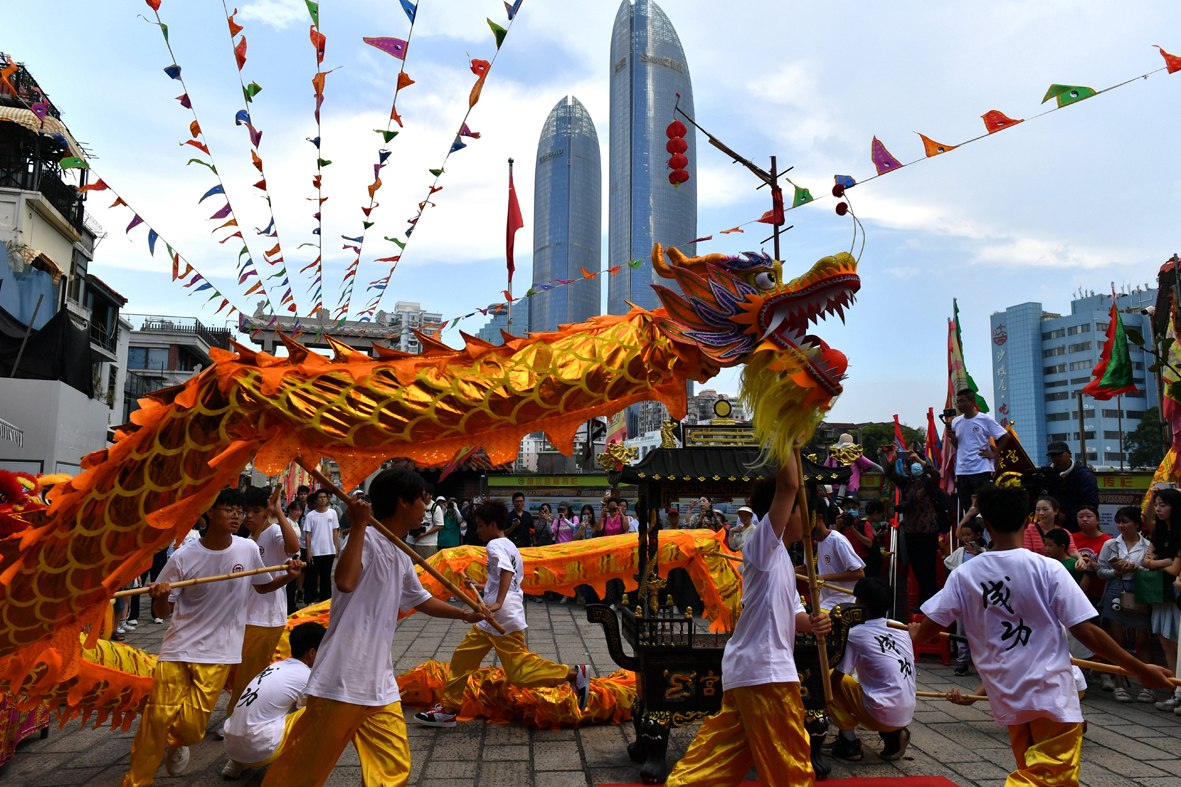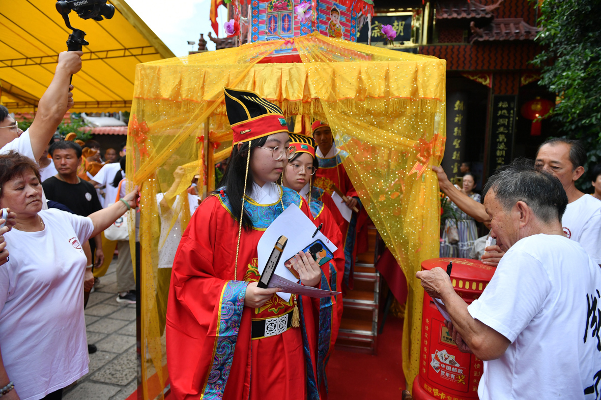 8月22日,闽南地区人生礼俗“七娘妈生做十六岁”在厦门朝宗宫举行。共有44名少年参加活动,其中5位金门少年,8位印尼籍少年。少年们穿状元服过平安桥、成年门,踩街结束后,手捧清茶孝奉尊亲。图为少年们过平安桥和成人门。(图片来源:中新社)