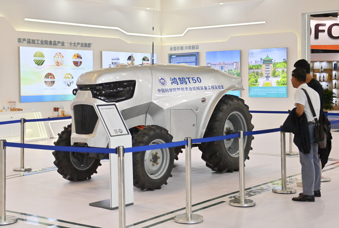 图为电动智能拖拉机吸引参观者。(图片来源:中新社)