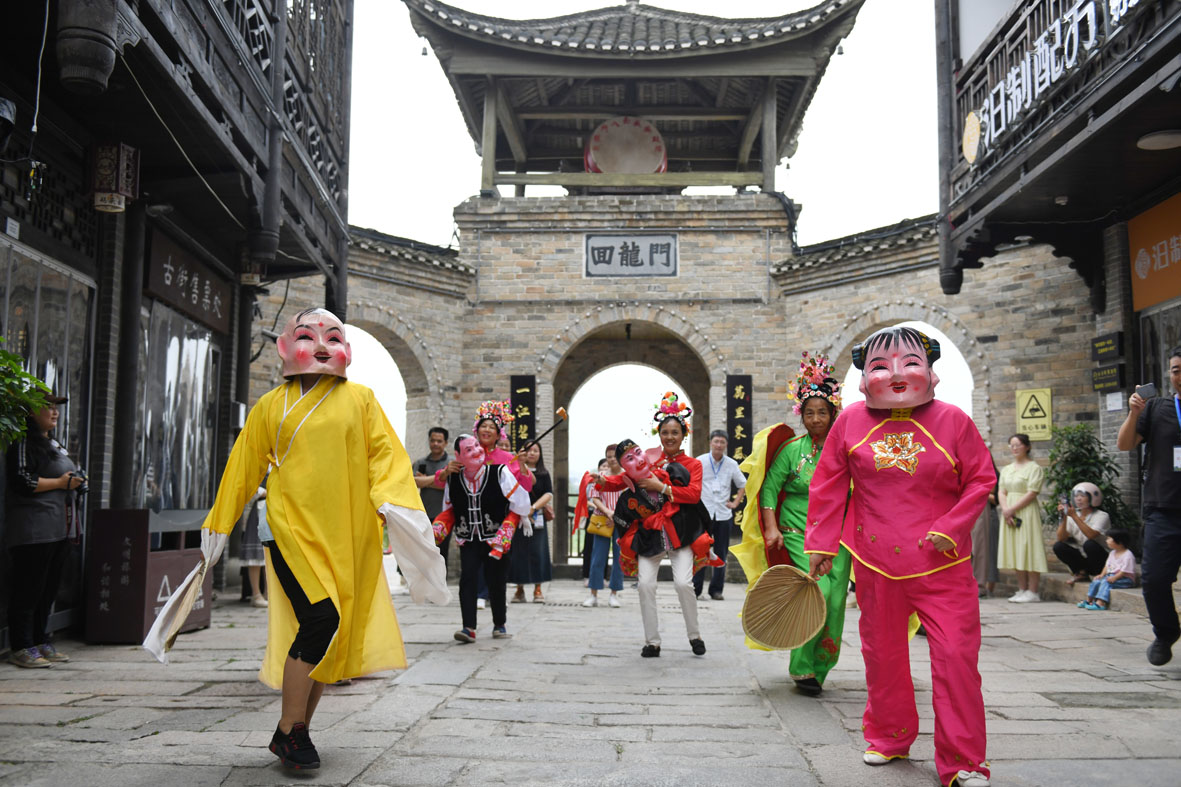9月12日,参加“行走中国·2023年海外华文媒体高层岳阳行”的12国华媒代表走进湖南岳阳汨罗长乐镇,感受当地传承千年的古法甜酒酿造、地故事、长乐抬阁故事会等非遗文化。图为当地居民走上街头表演“地故事”。(图片来源:中新社)