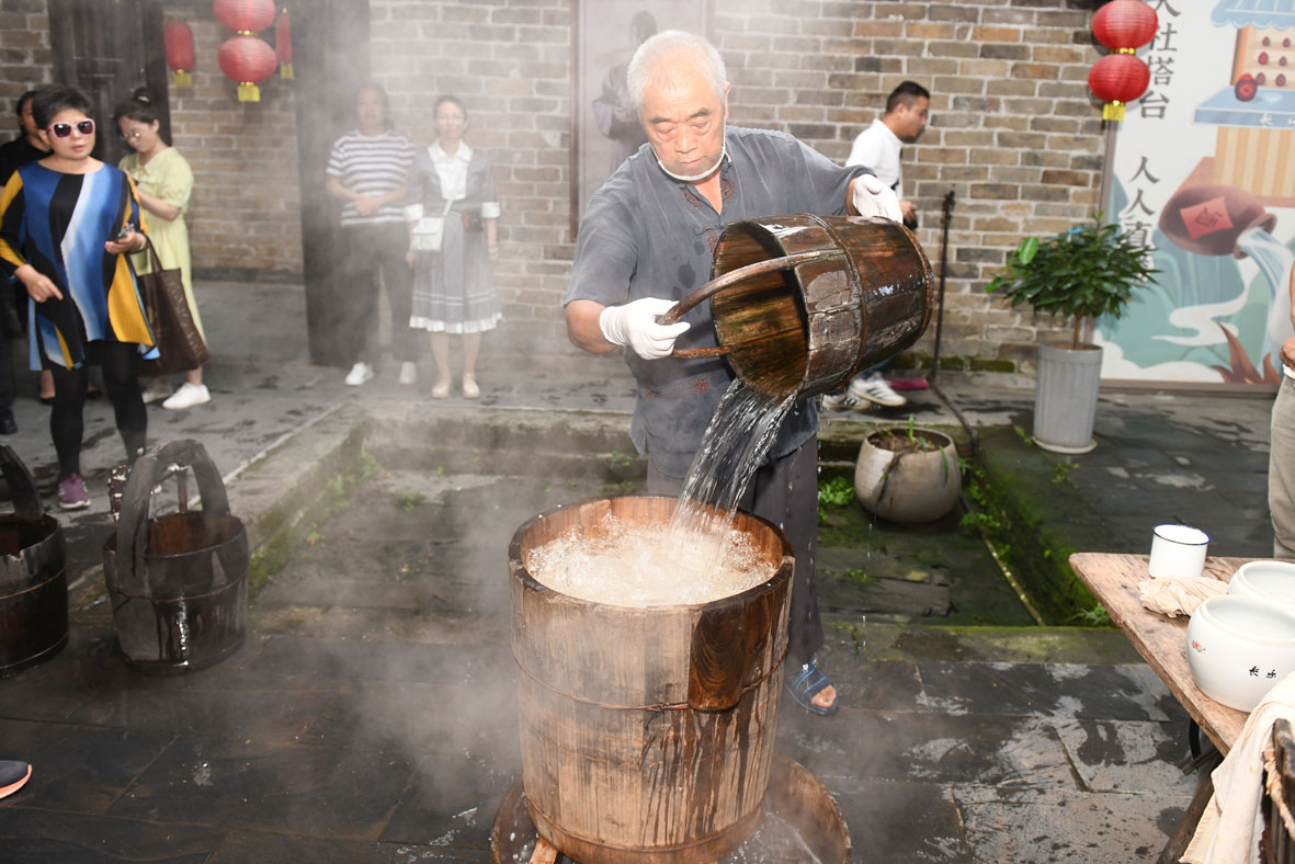 图为长乐甜酒酿造技艺非遗传承人熊湘和展示甜酒酿造。(图片来源:中新社)