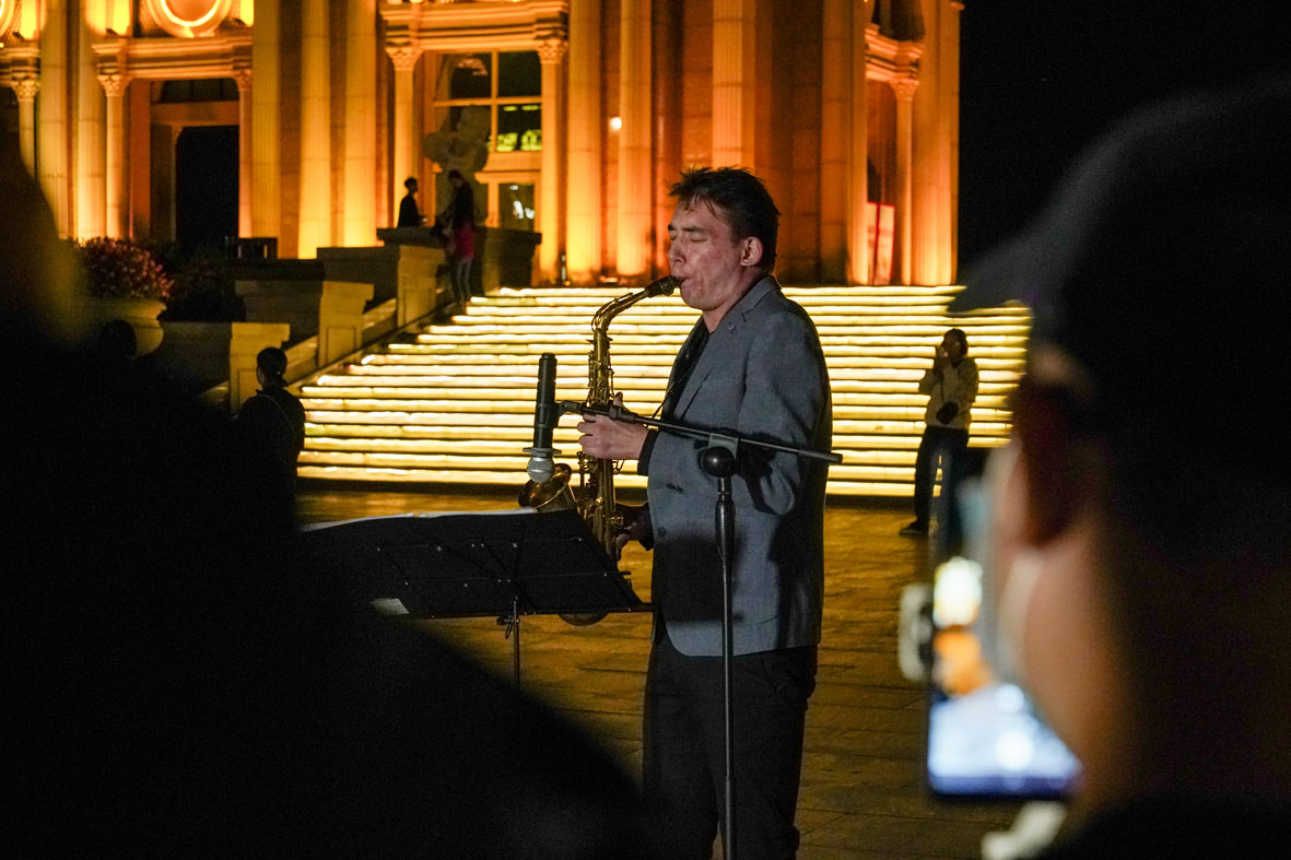 9月13日,黑龙江哈尔滨,演奏者吹萨克斯。当晚,黑龙江省首届中俄地方文化艺术季街头路演在音乐长廊举行。(图片来源:中新社)