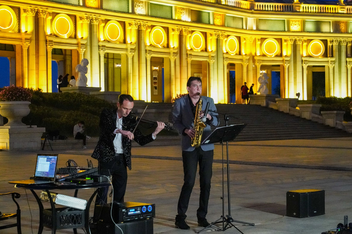 9月13日,黑龙江哈尔滨,演奏者奏响小提琴和萨克斯二重奏。当晚,黑龙江省首届中俄地方文化艺术季街头路演在音乐长廊举行。(图片来源:中新社)