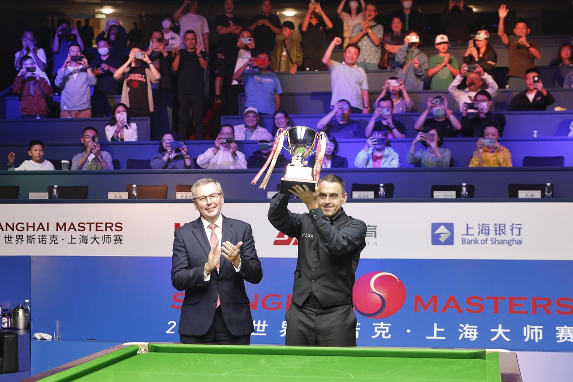 9月17日晚,2023世界斯诺克·上海大师赛收官。罗尼·奥沙利文11:9力克卢卡·布雷切尔,实现上海大师赛四连冠。图为罗尼·奥沙利文举起奖杯。(图片来源:中新社)