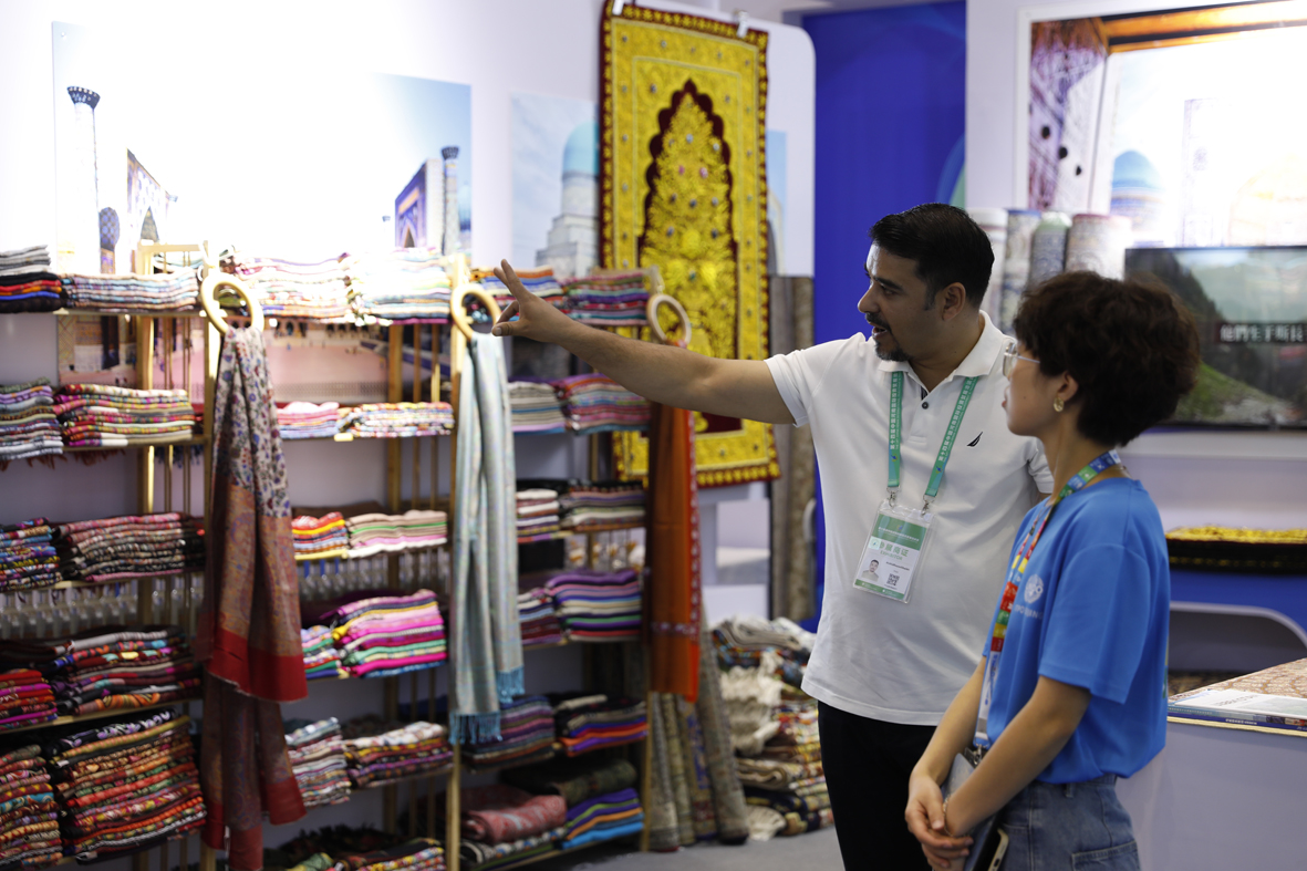 9月26日,第十四届中国河南国际投资贸易洽谈会在河南郑州举行。图为乌兹别克斯坦展区工作人员向来宾介绍产品。(图片来源:中新社)