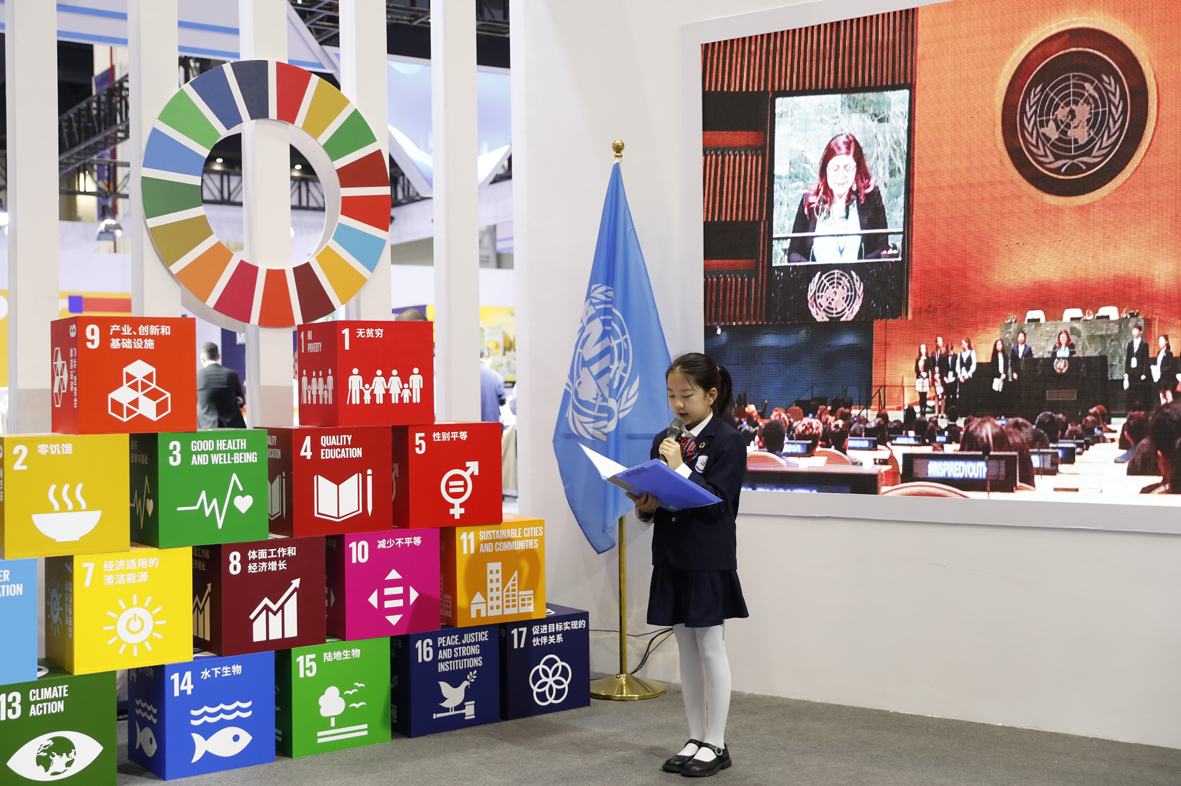 图为一名小朋友在联合国工业发展组织展区演讲。(图片来源:中新社)