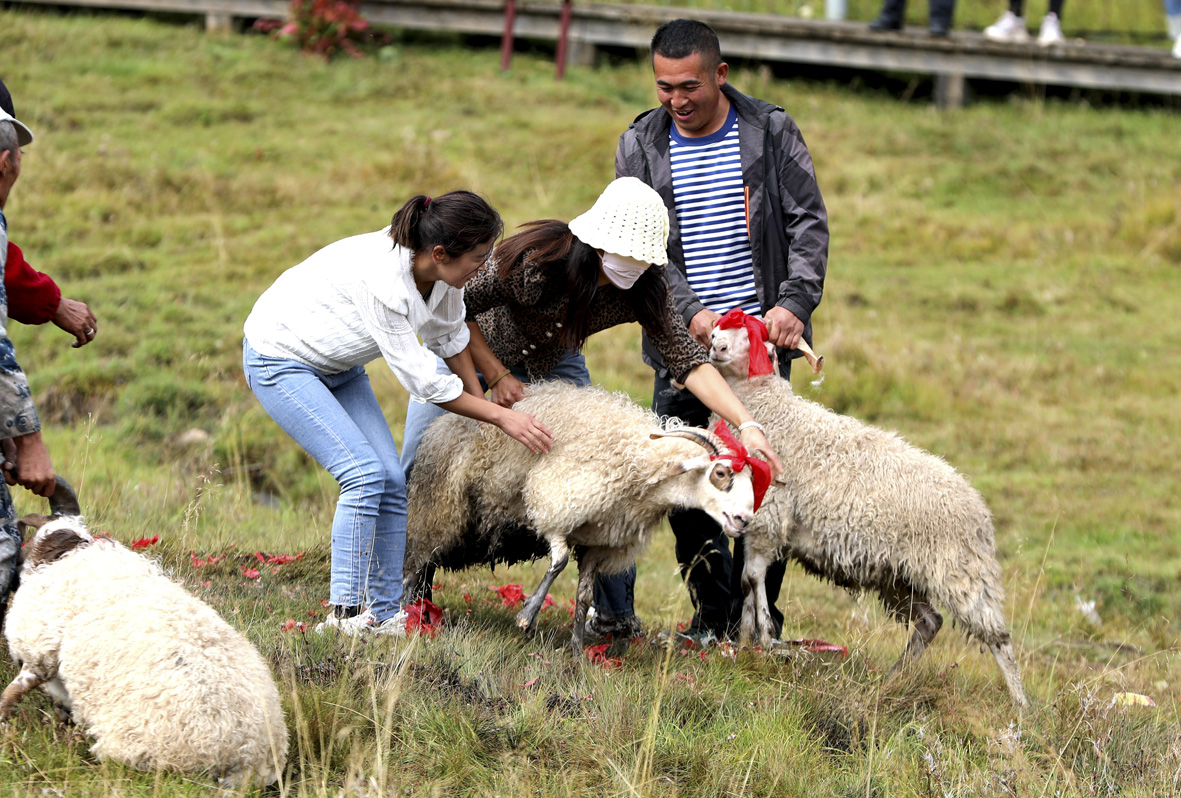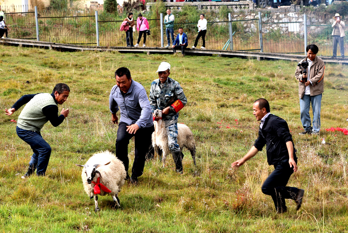 9月28日,青海省西宁市,抓羊大赛参赛队员在赛场上抓羊。当日,第五届乡趣卡阳景区徒手抓羊大赛在青海省西宁市湟中区拦隆口镇卡阳村举行。图片来源:中新社