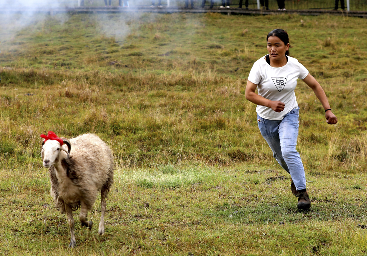 9月28日,青海省西宁市,抓羊大赛女队员在赛场上抓羊。图片来源:中新社