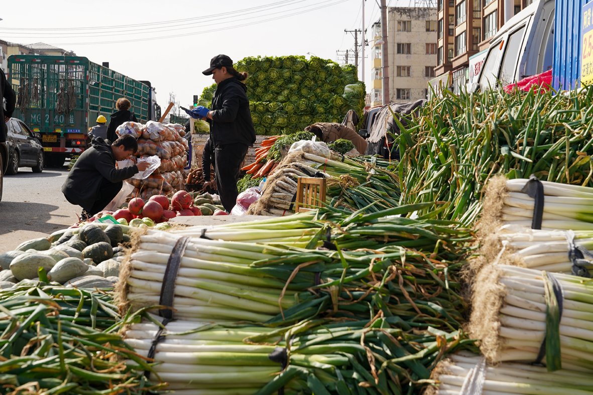 10月8日正值寒露节气,黑龙江哈尔滨,市民开启“囤秋菜”模式,为即将到来的冬天做准备。满载大葱、白菜、土豆等秋菜的货车停靠在指定销售区域,市民们穿梭其中挑选秋菜。储存秋菜过冬已成为东北人独特的“过冬仪式”。图为市民挑选秋菜。(图片来源:中新社)