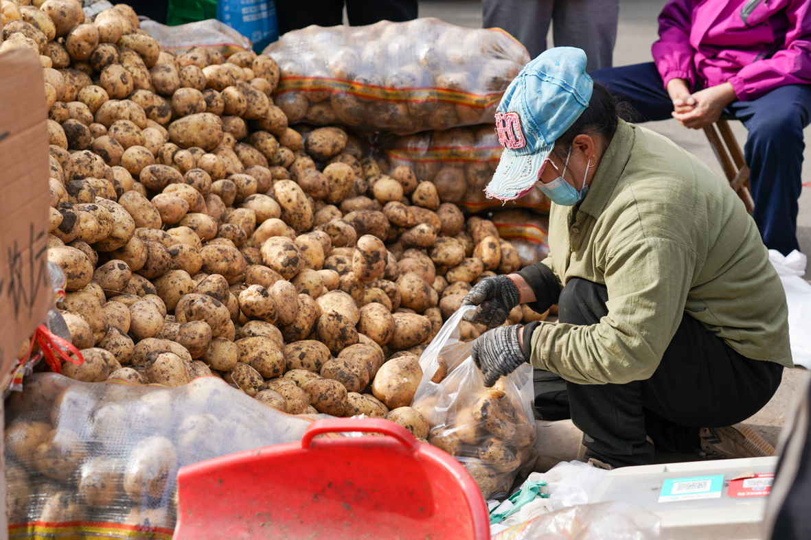 图为商贩为市民装土豆。(图片来源:中新社)