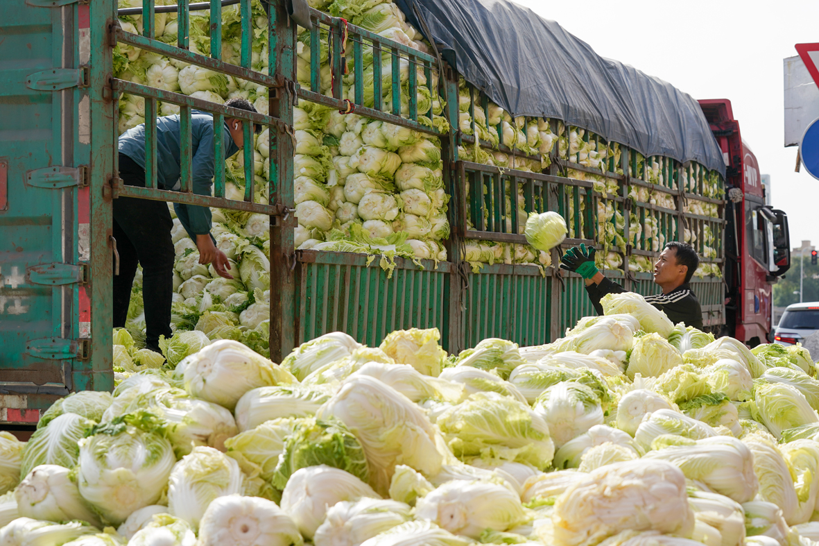 图为商贩正从车上卸白菜。(图片来源:中新社)