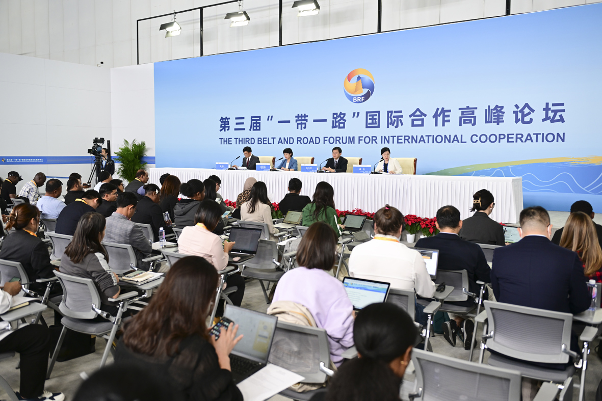 10月16日下午,第三届“一带一路”国际合作高峰论坛新闻中心在位于北京的国家会议中心举行吹风会,邀请生态环境部国际合作司和对外合作与交流中心负责人介绍有关情况,并回答记者提问。图为吹风会现场。 (图片来源:中新社)