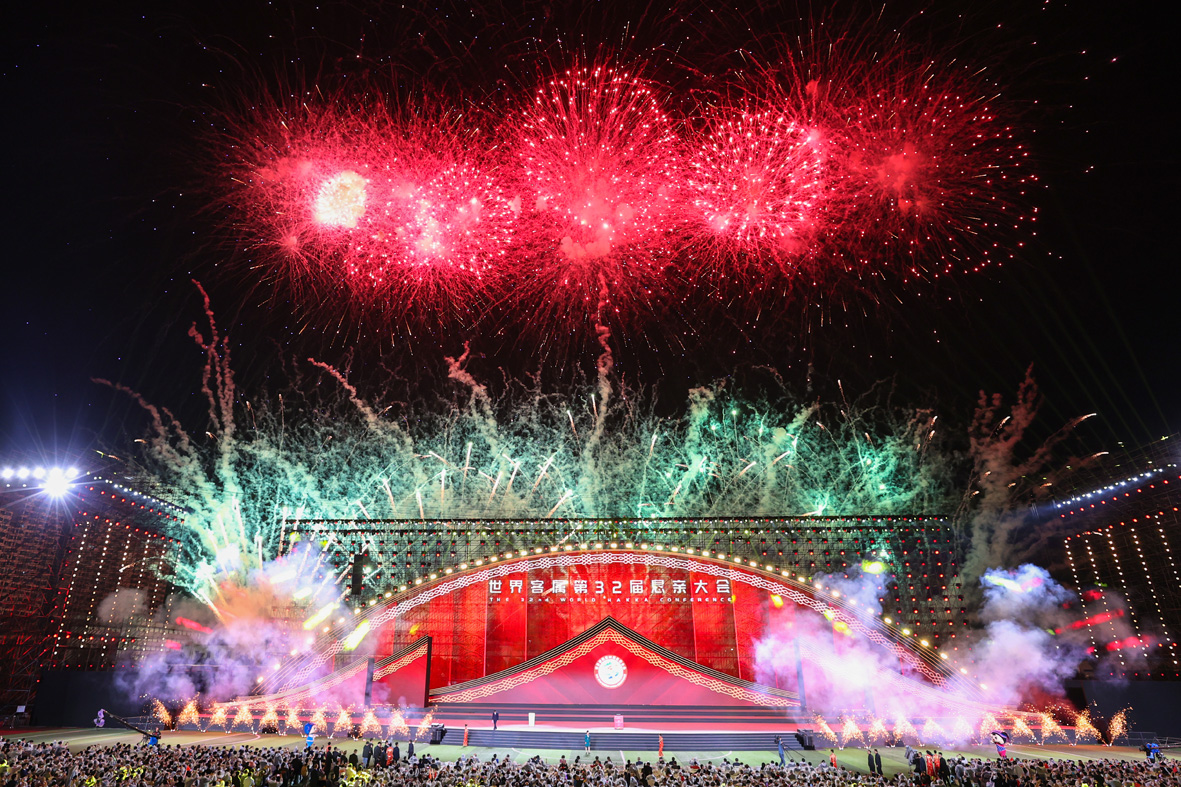 11月7日,以“五洲客家音,四海桑梓情”为主题的世界客属第32届恳亲大会(简称“世客会”)在“世界围屋之都”江西省赣州市龙南市开幕,这是“世客会”创办50多年来首次在中国内陆县级城市举办。图为开幕式文艺晚会焰火表演。(图片来源:中新社)