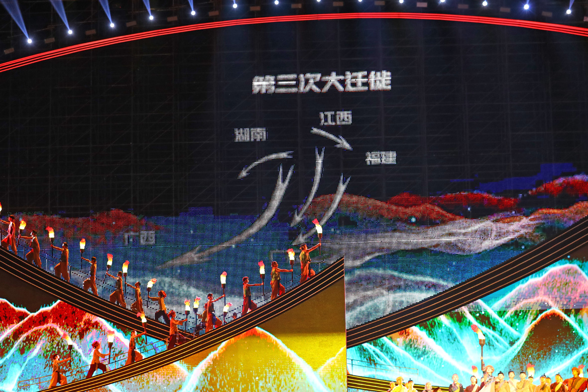 图为开幕式文艺晚会展示客家大迁徙。(图片来源:中新社)