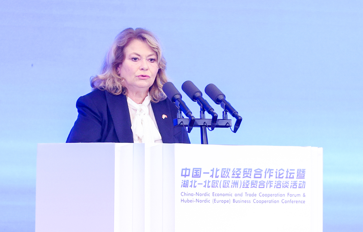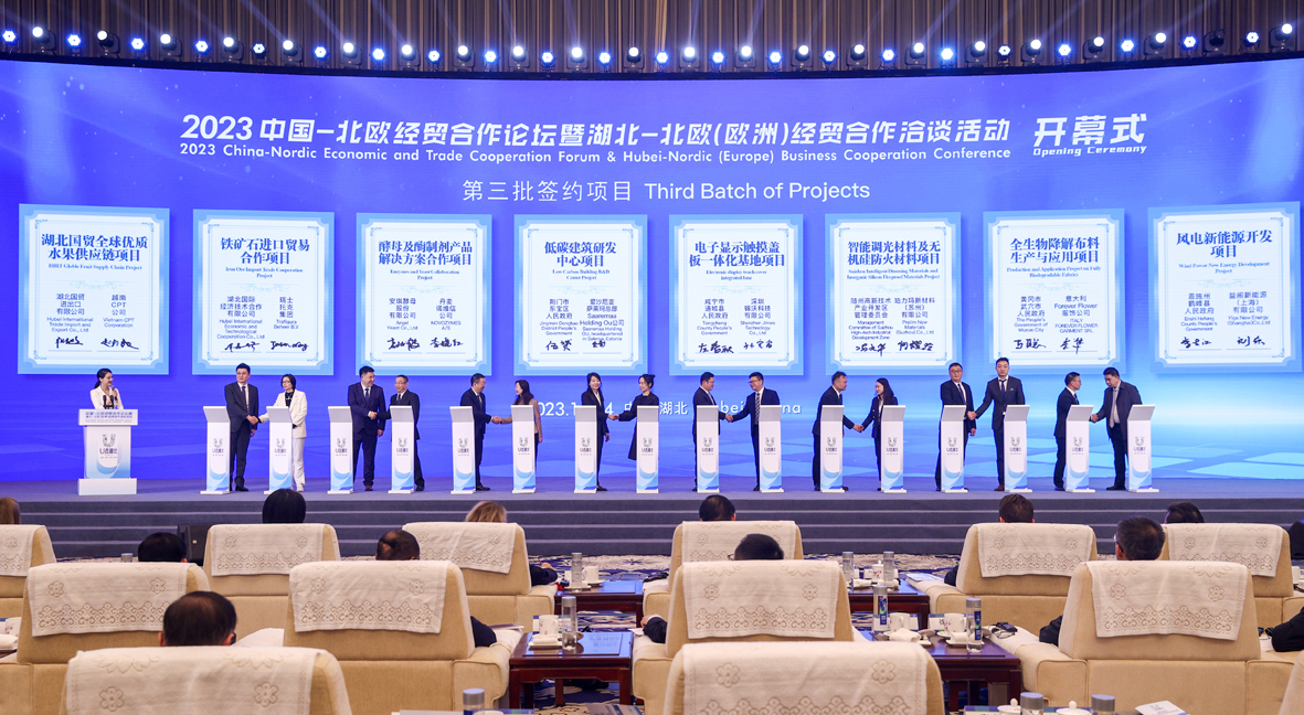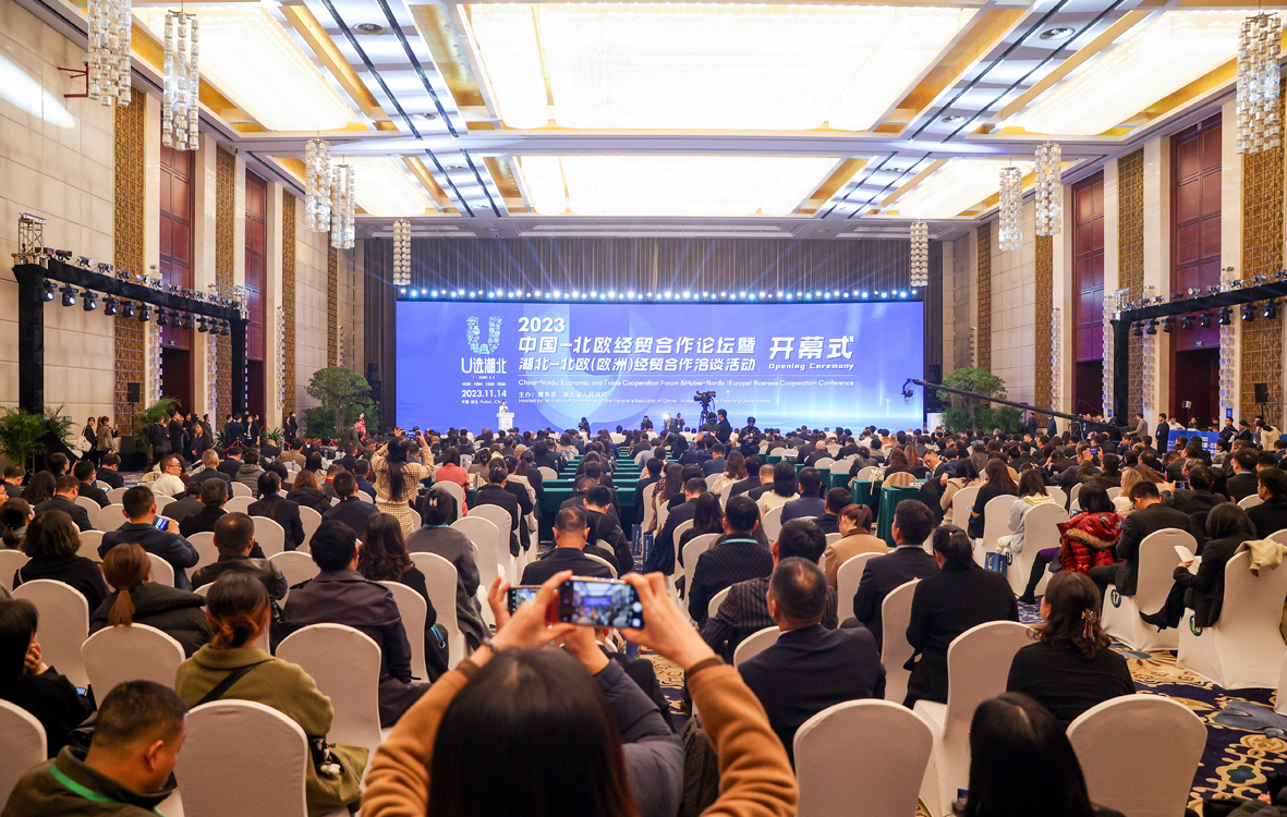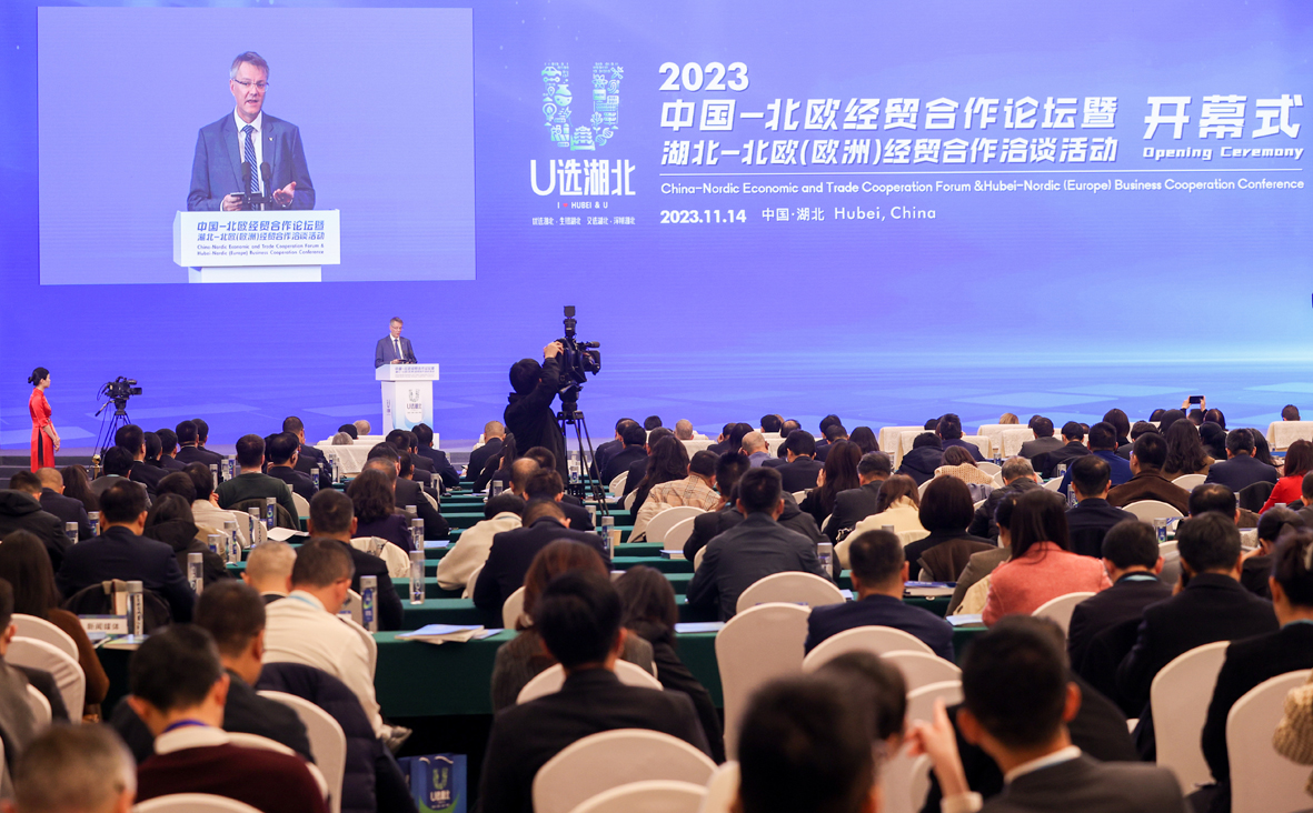 11月14日,2023中国—北欧经贸合作论坛暨湖北—北欧(欧洲)经贸合作洽谈活动在湖北武汉开幕。本届论坛以“打造新质生产力 谱写对欧新篇章”为主题,重点就湖北省五大优势产业和九大新兴特色产业进行专题推介。图为开幕式现场。(图片来源:中新社)