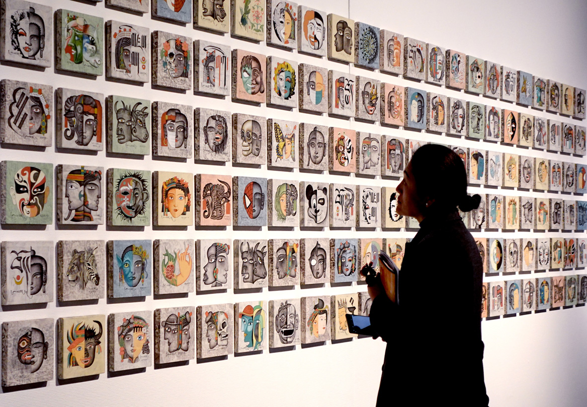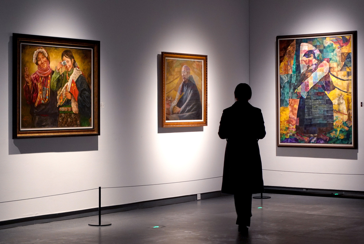11月15日,“高原·境界——西藏美术馆开馆展”开幕式在拉萨市举行。本次开馆展包括“西藏题材当代美术成果展”“传承·创新精品唐卡展”等分展,展出吴作人、李可染、安多强巴等著名艺术家的近300幅(座)作品。图为观众欣赏展览中的美术作品。(图片来源:中新社)