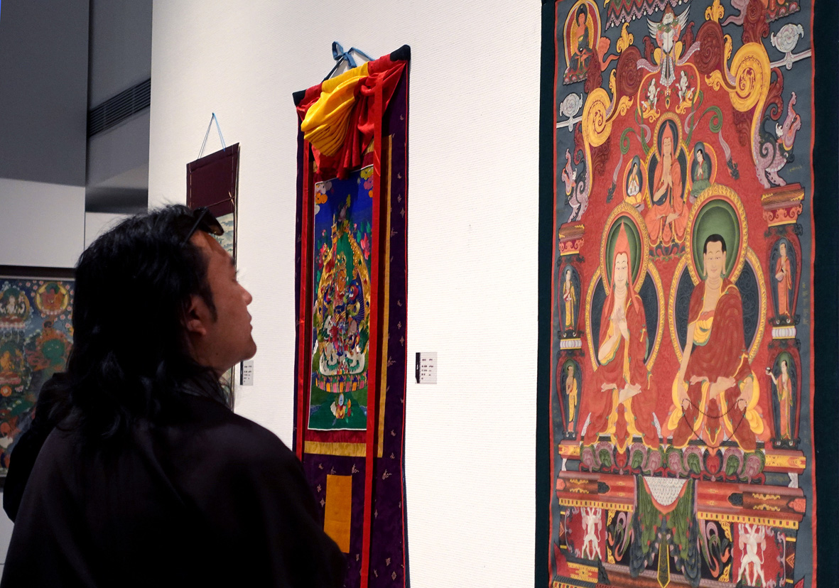 图为观众欣赏展览中的唐卡作品。(图片来源:中新社)
