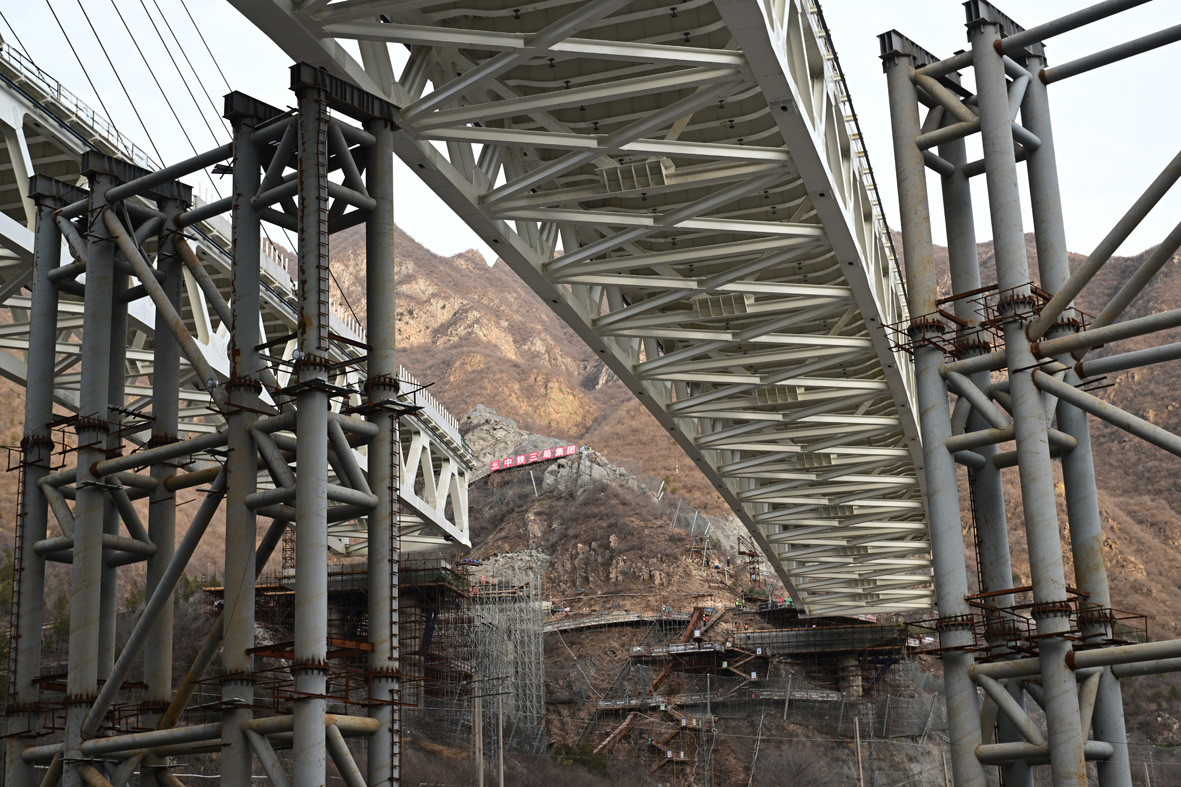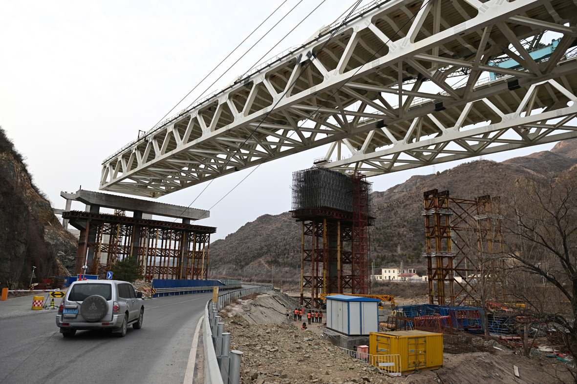 11月28日,国道109新线高速公路工程安家庄特大桥上跨丰沙铁路转体桥顺利完成转体。该桥位于北京市门头沟区王平镇安家庄村,为世界首例墩顶双转体曲线钢桁梁斜拉桥,跨越丰沙铁路、永定河、109国道。图为转体桥在转体中。(图片来源:中新社)