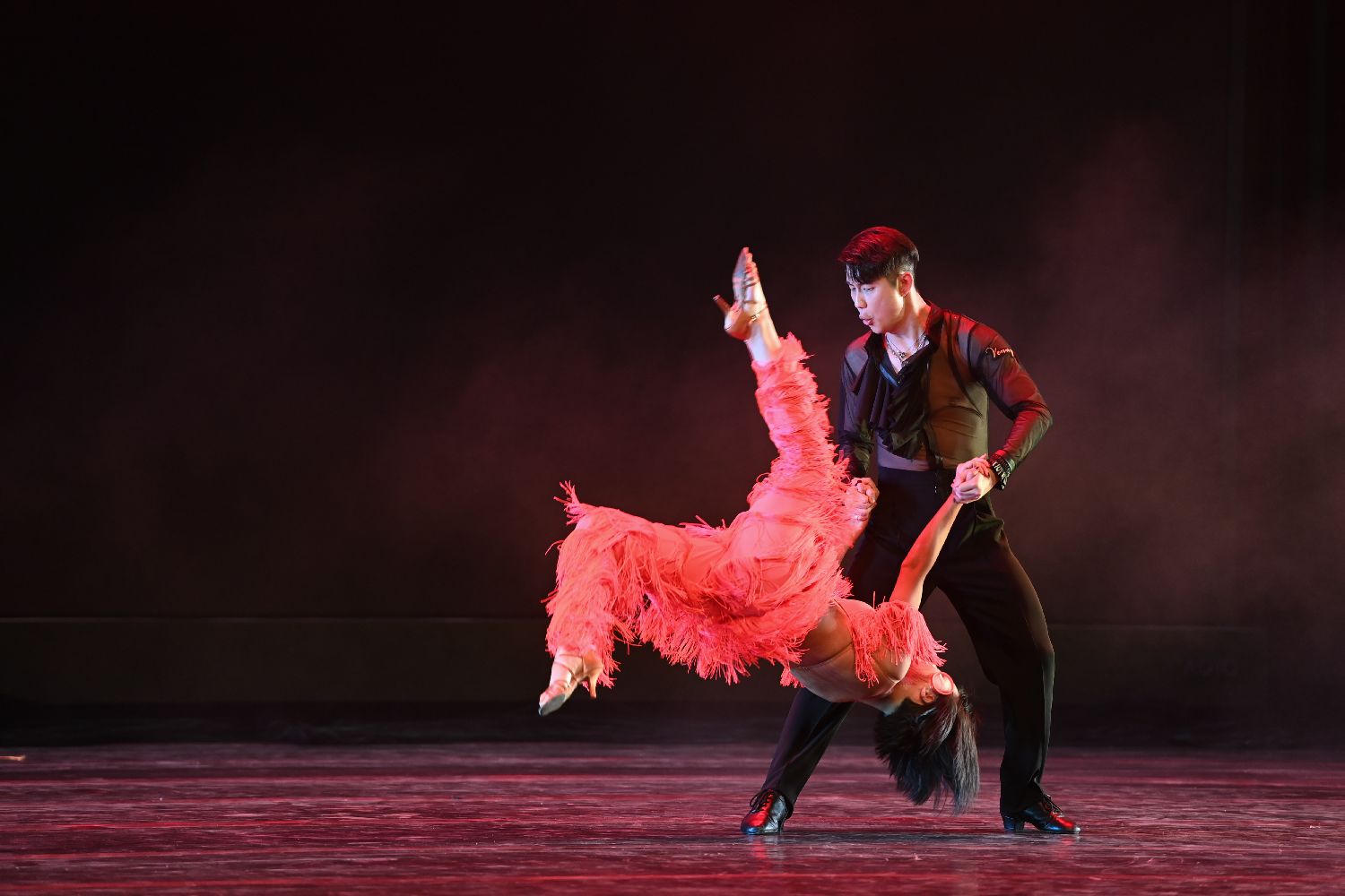 12月4日晚,广东广州,舞者夏天、曾聪表演国标舞《桑巴》。(图片来源:中新社)