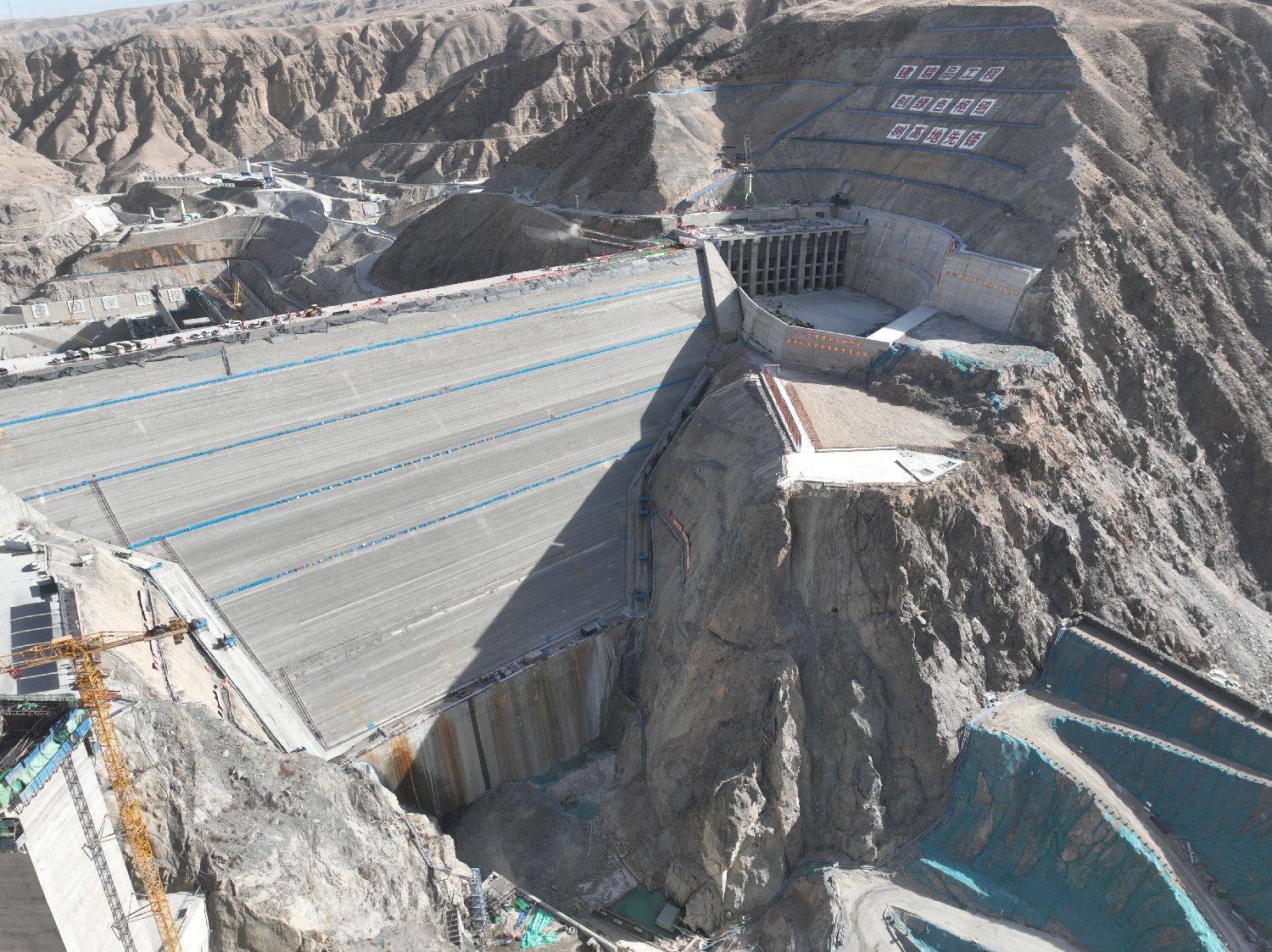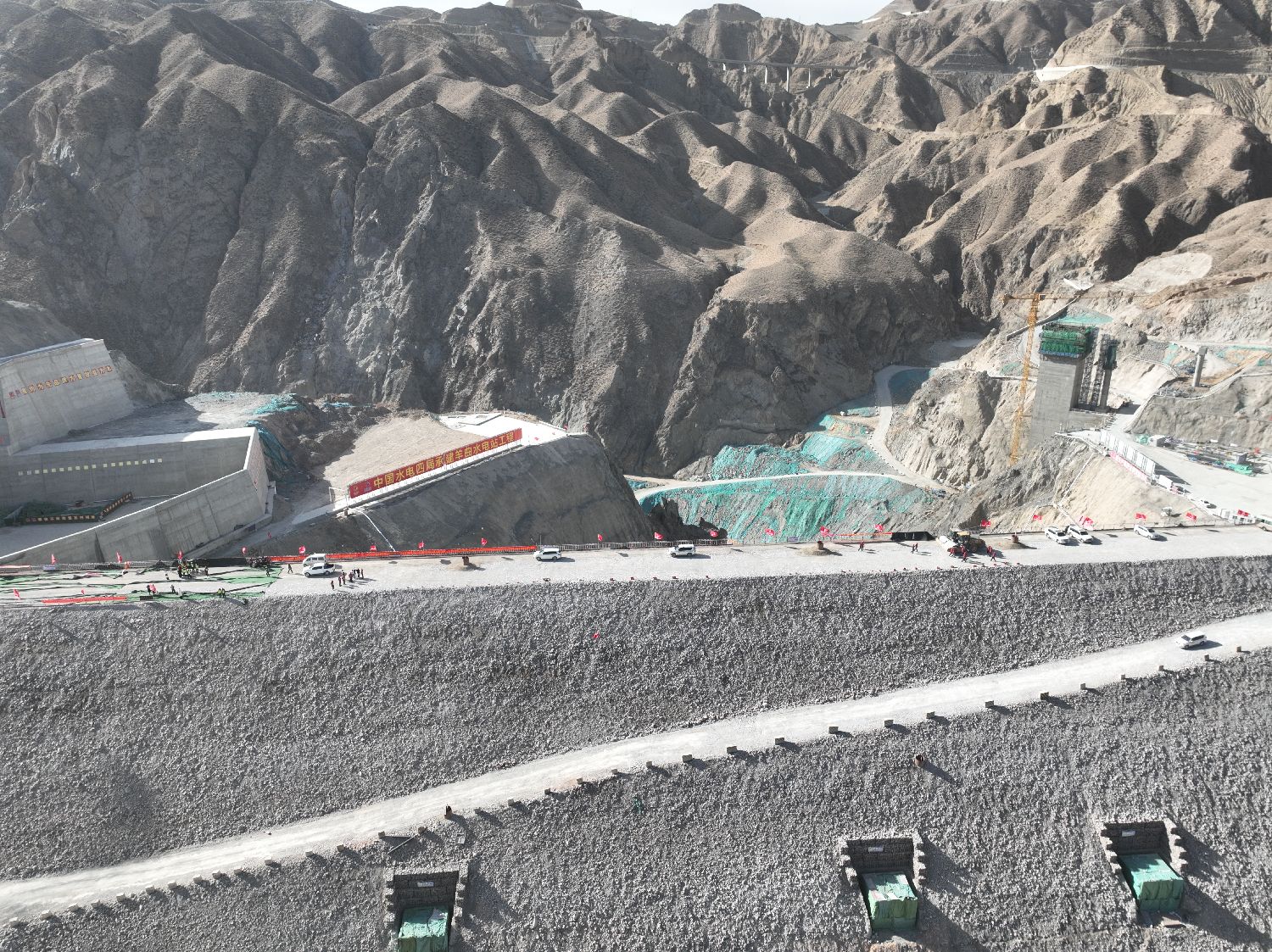 图为航拍大坝坝体填筑到顶现场。(无人机照片)(图片来源:中新社)