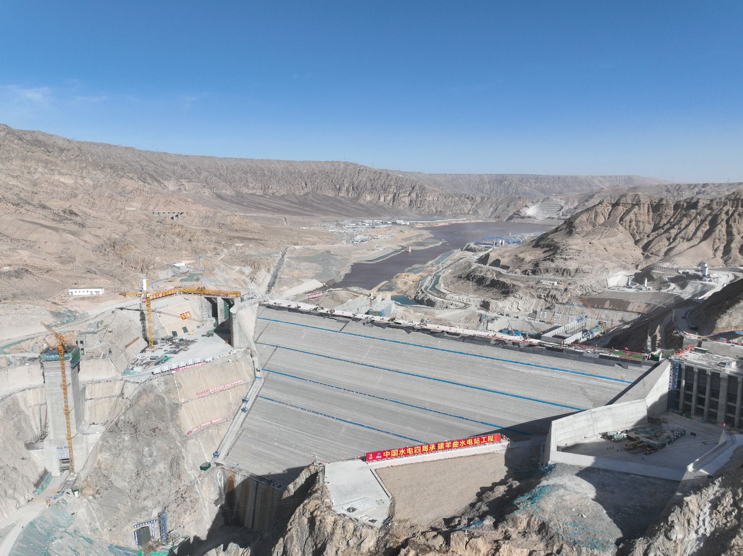 12月14日,由中国水利水电第四工程局有限公司承建的中国首座镶嵌混凝土面板堆石坝——黄河羊曲水电站大坝坝体填筑到顶,主坝总填筑量为360万立方米,填筑至高程2717.5青海省海南藏族自治州米。图为航拍大坝坝体填筑到顶现场。(无人机照片)(图片来源:中新社)