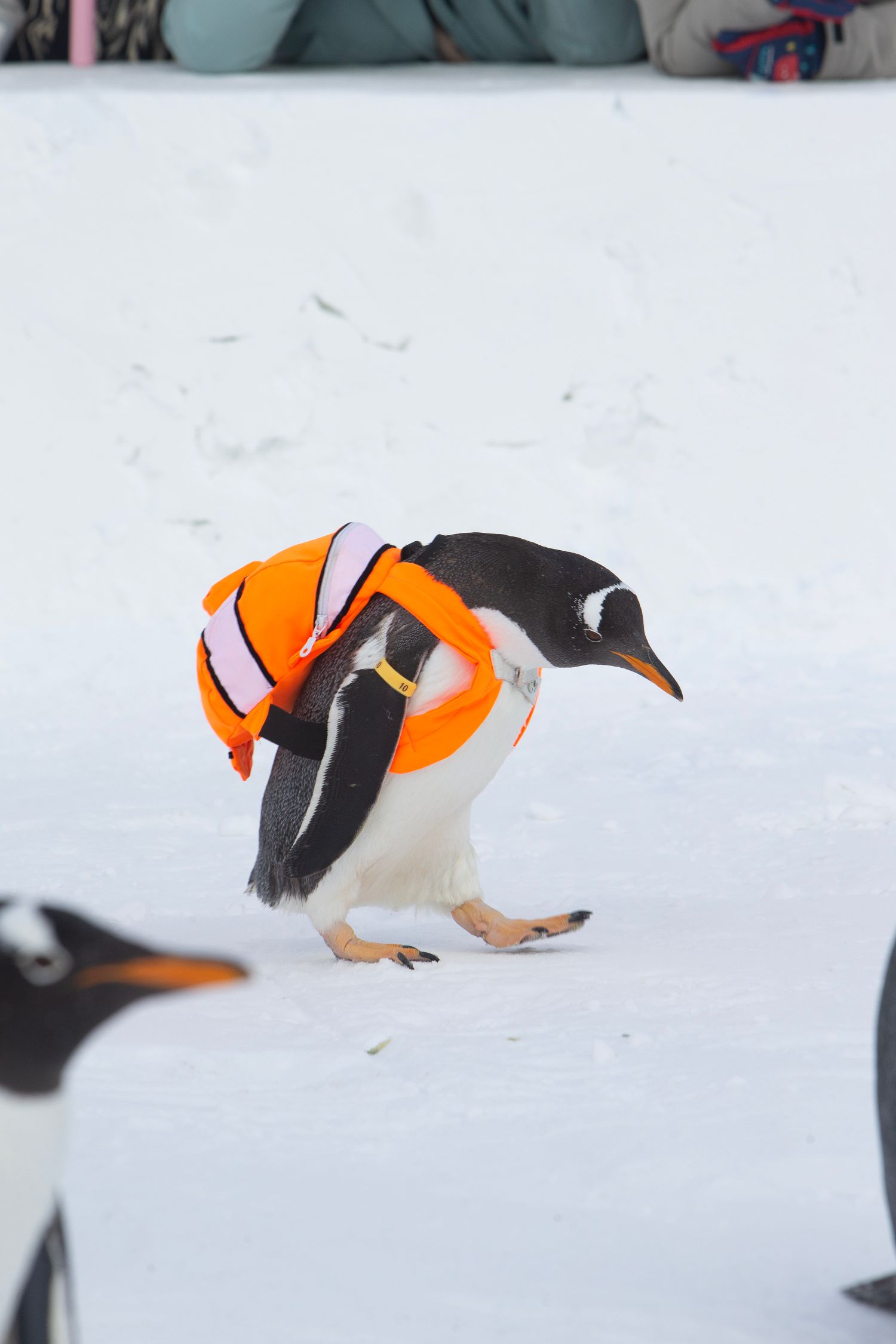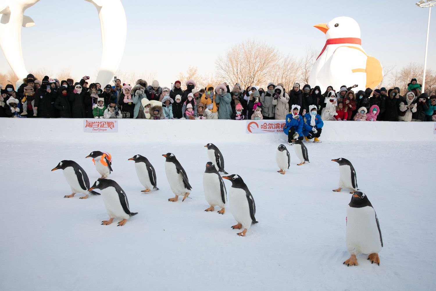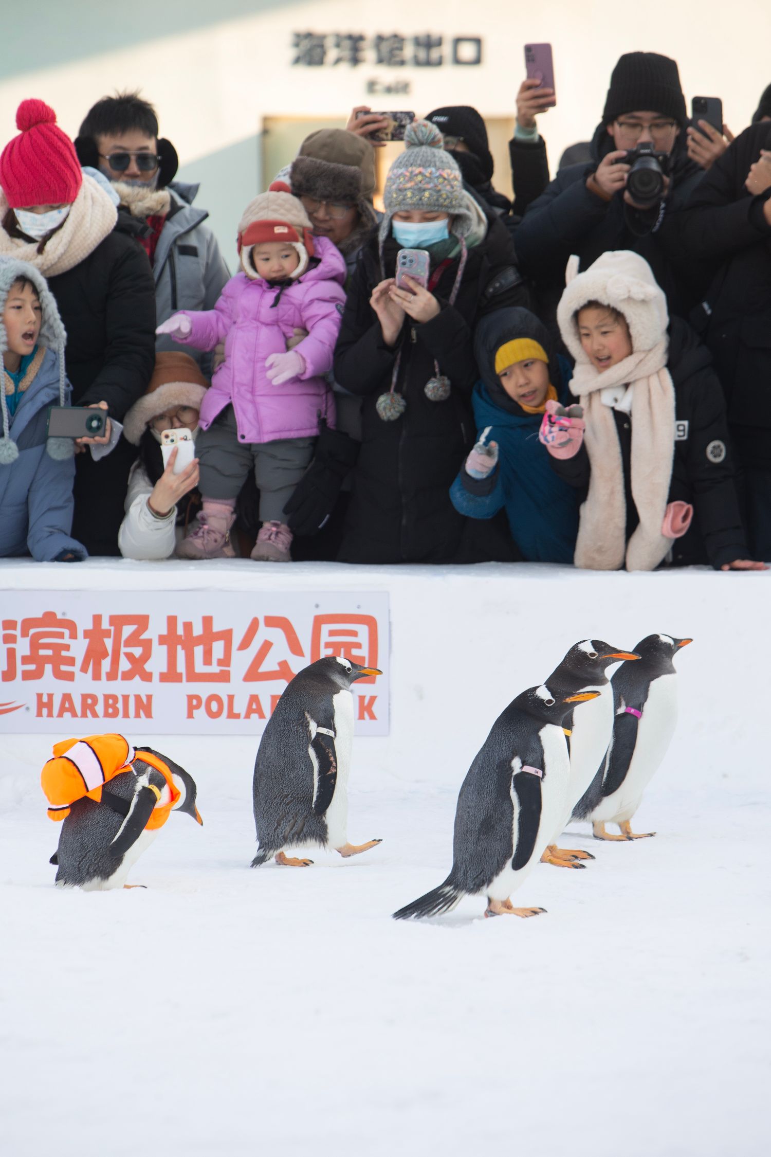 12月23日,黑龙江哈尔滨极地公园“淘学企鹅”冰雪大巡游正式启动,企鹅们在雪地上悠然踱步的样子呆萌可爱,吸引众多游客围观、拍照。(图片来源:中新社)