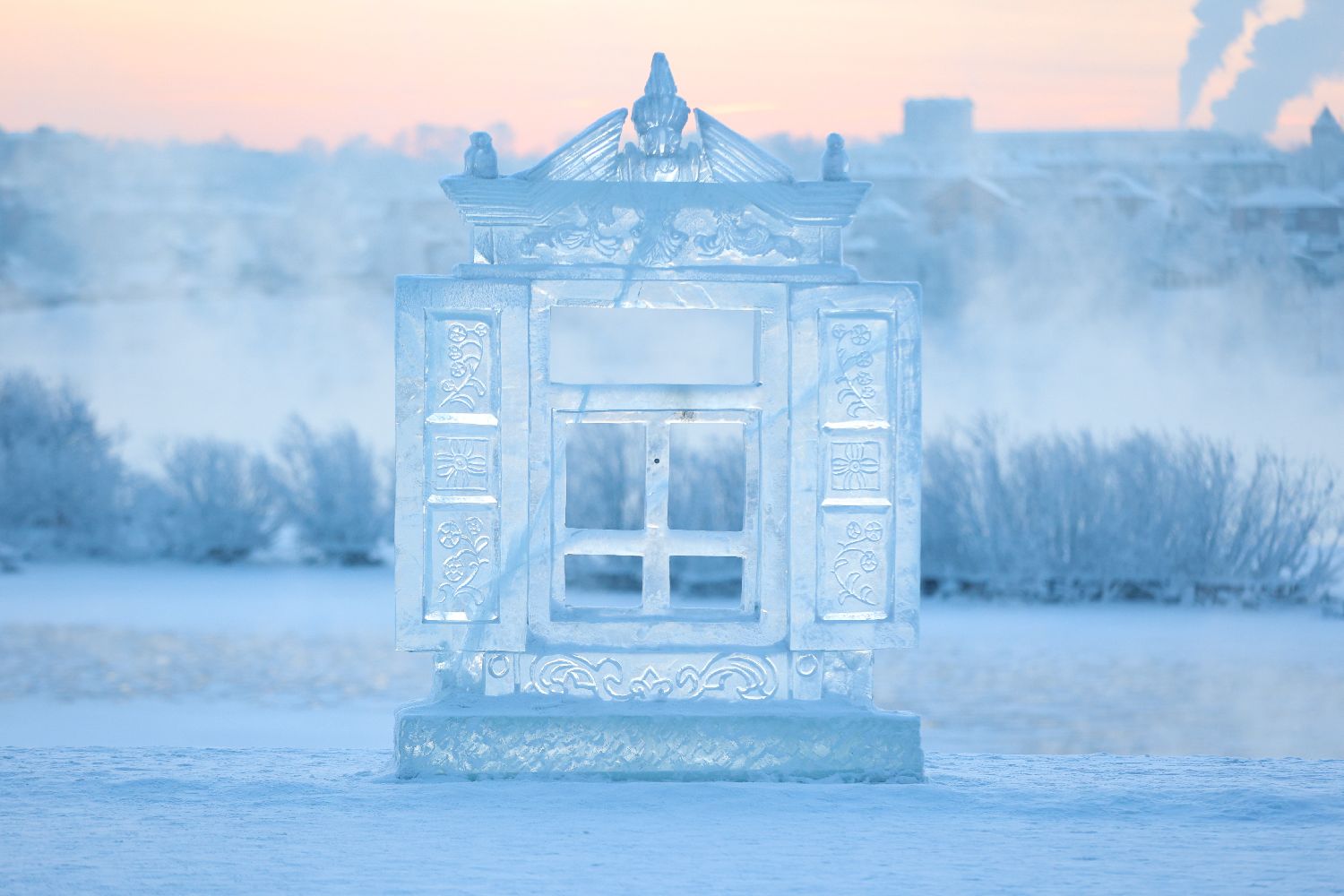 当地时间2023年12月22日,俄罗斯伊尔库茨克,为“Shchastye Chistoi Body”(清水的幸福)项目雕刻的冰雕。(图片来源:CFP)