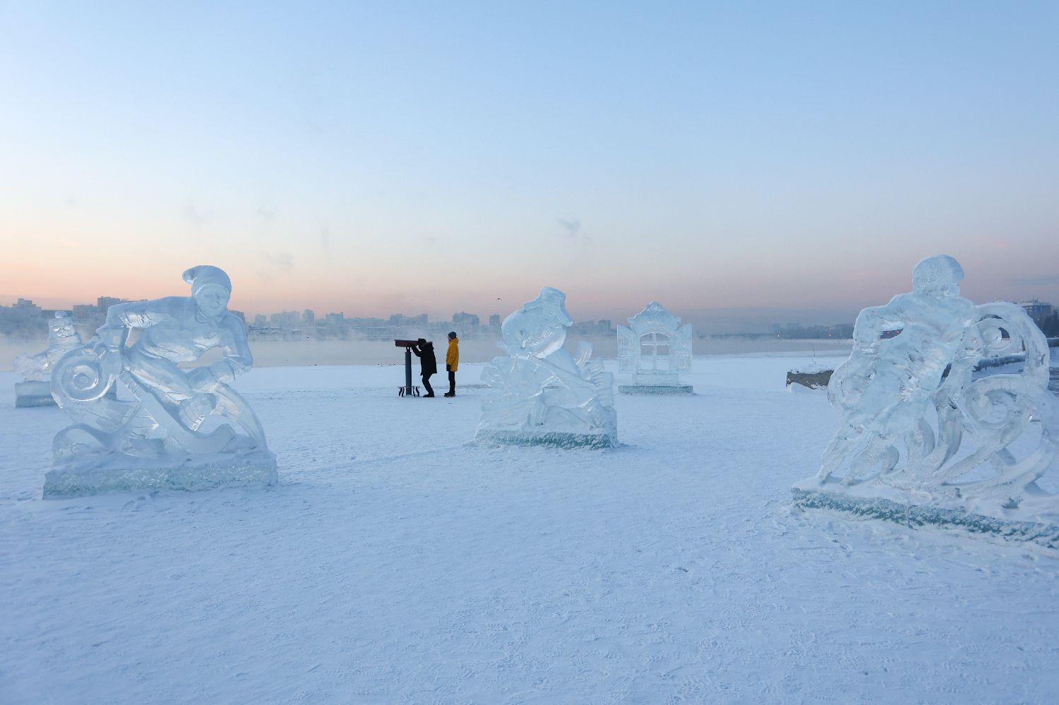 当地时间2023年12月22日,俄罗斯伊尔库茨克,民众走过为“Shchastye Chistoi Body”项目而雕刻的冰雕。(图片来源:CFP)