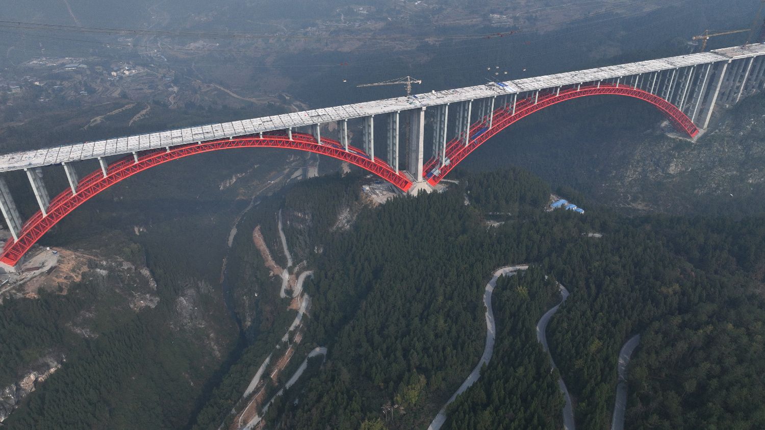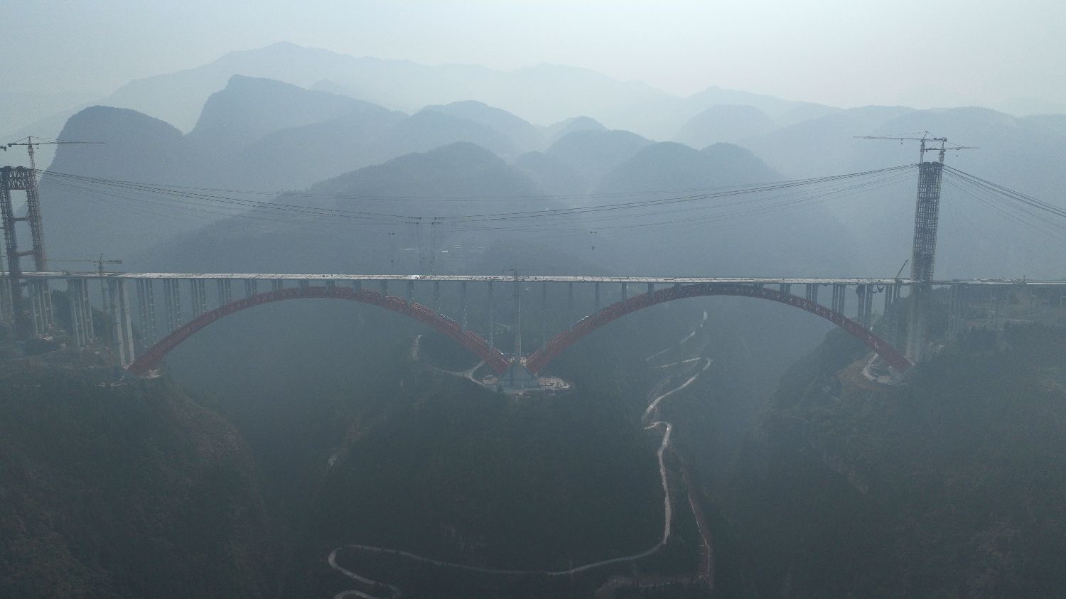 12月27日,渝湘复线高速公路双堡特大桥实现全桥合龙。据介绍,该桥为世界在建最大跨径双跨连续拱桥。作为渝湘复线高速公路重点工程,双堡特大桥位于重庆市武隆区,长1620米,单幅桥面宽度16米,设双向六车道。其所处位置特殊,面临“W峡谷”地形、岩溶地质等困难,建设难度大。图为航拍渝湘复线高速公路双堡特大桥。(无人机照片)(图片来源:中新社)