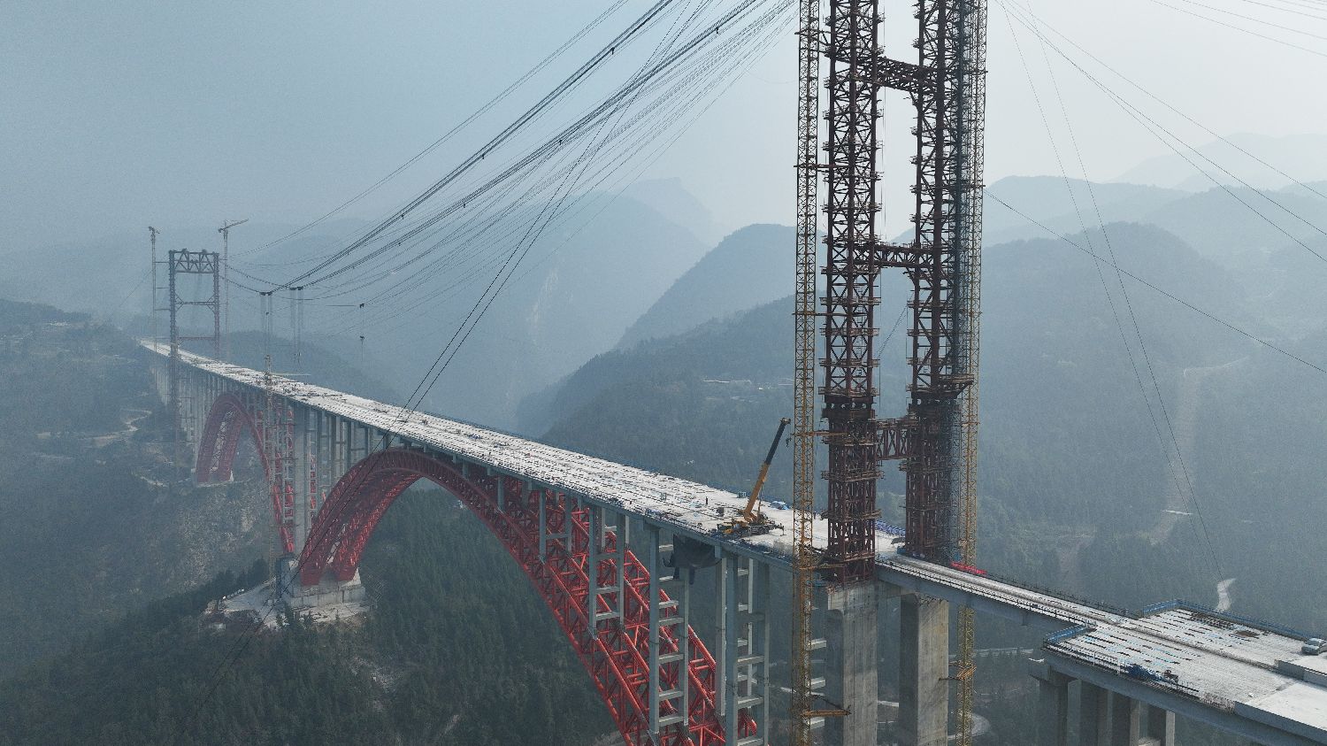 12月27日,渝湘复线高速公路双堡特大桥实现全桥合龙。据介绍,该桥为世界在建最大跨径双跨连续拱桥。作为渝湘复线高速公路重点工程,双堡特大桥位于重庆市武隆区,长1620米,单幅桥面宽度16米,设双向六车道。其所处位置特殊,面临“W峡谷”地形、岩溶地质等困难,建设难度大。图为航拍渝湘复线高速公路双堡特大桥。(无人机照片)(图片来源:中新社)