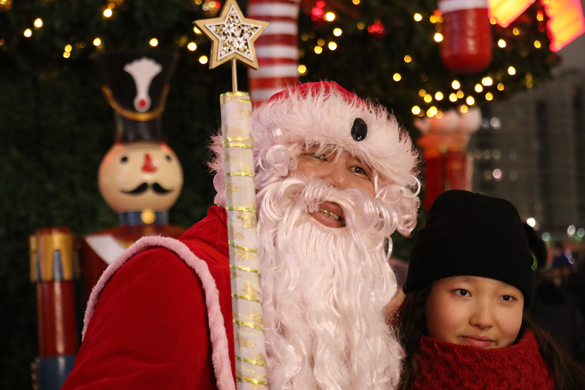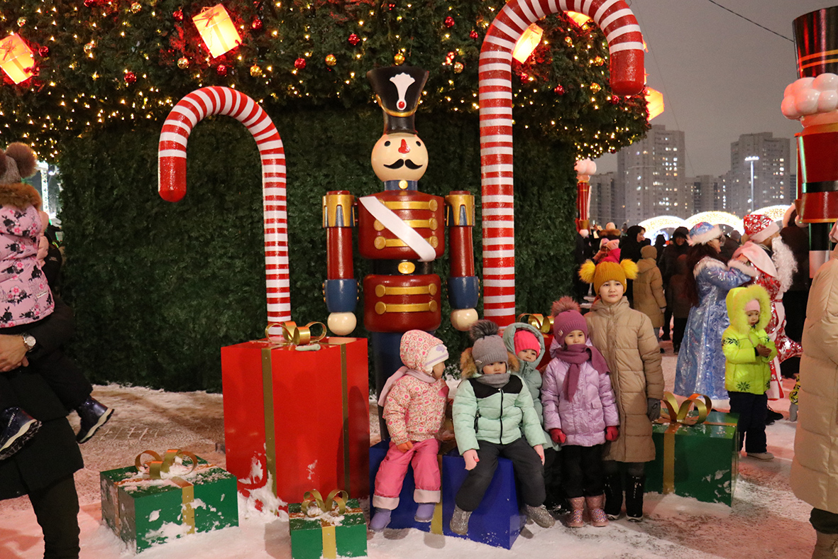 当地时间2023年12月31日,民众在哈萨克斯坦阿斯塔纳独立广场迎接新年的到来。图为哈家长为孩子们拍摄新年照片。(图片来源:中新社)