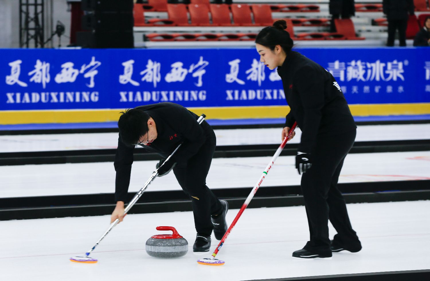 图为北京队选手在混双组比赛中擦冰。(图片来源:中新社)