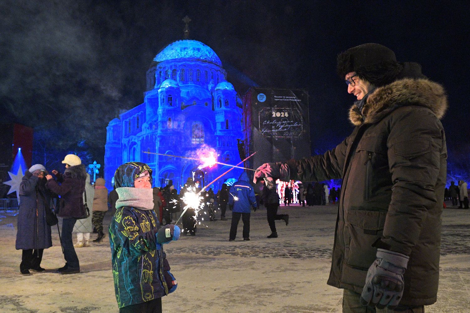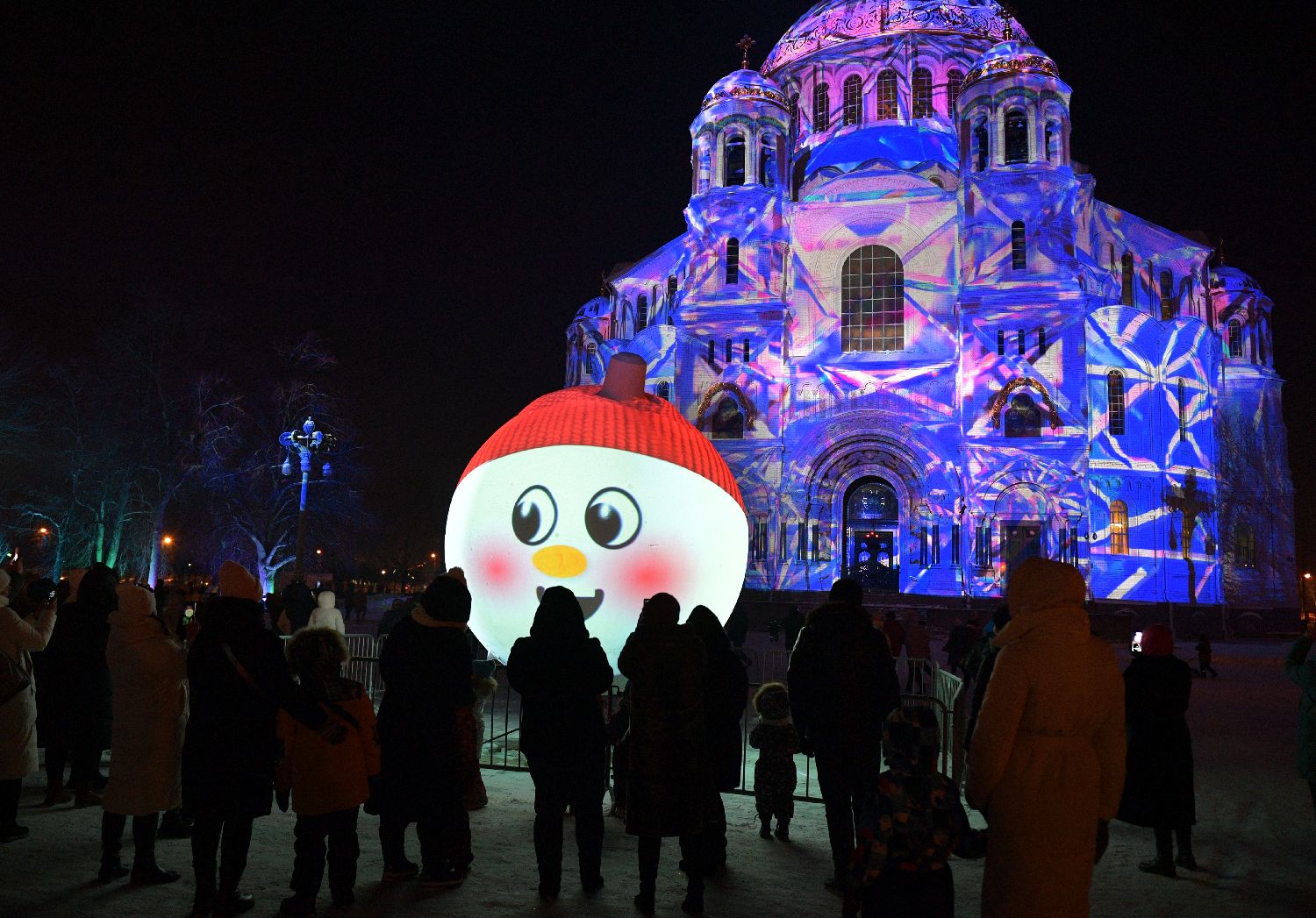 俄罗斯一教堂新年灯光秀亮起 观众身临其境感受光影变幻