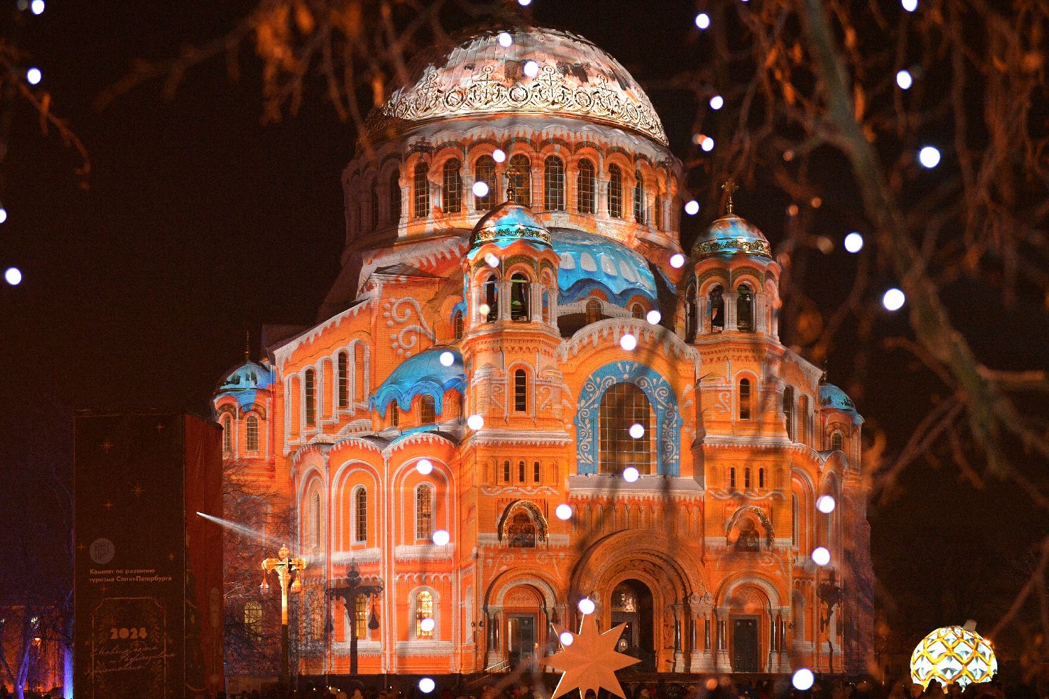 当地时间2024年月2日,俄罗斯喀琅施塔得,圣·尼古拉斯大教堂上演一场绚丽的新年灯光秀。(图片来源:CFP)