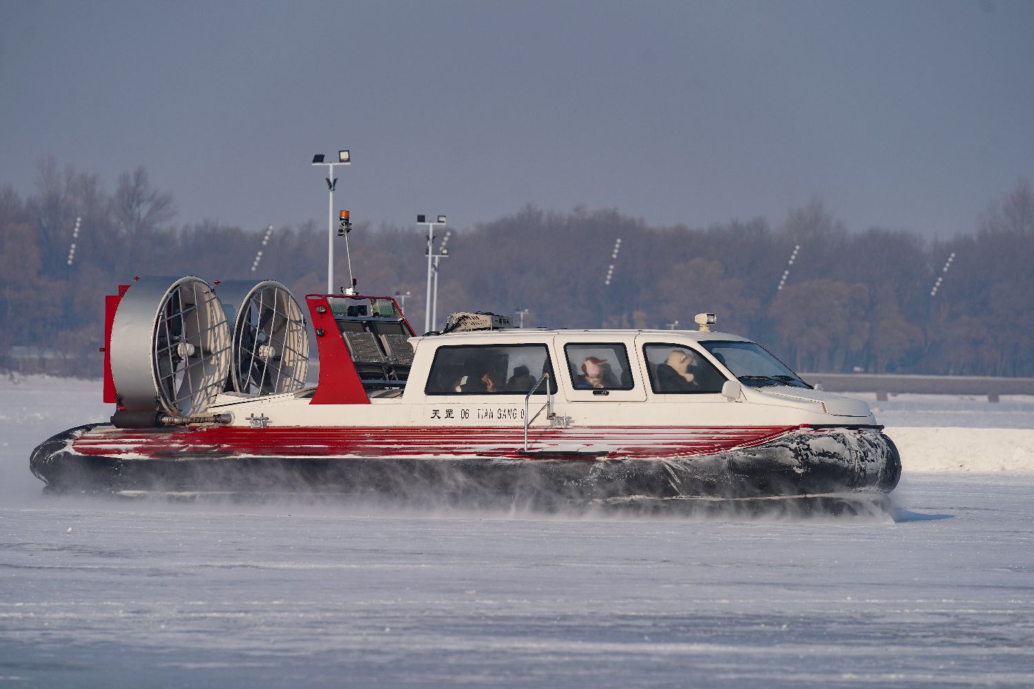 1月2日,在黑龙江哈尔滨松花江冰雪嘉年华内,冰雪气垫船吸引游客体验。气垫船利用高压空气在船底和冰面间形成气垫,在冰面最高时速可达65km/h。(图片来源:中新社)