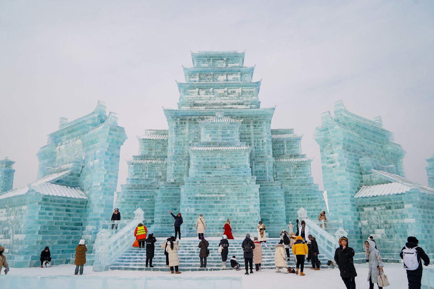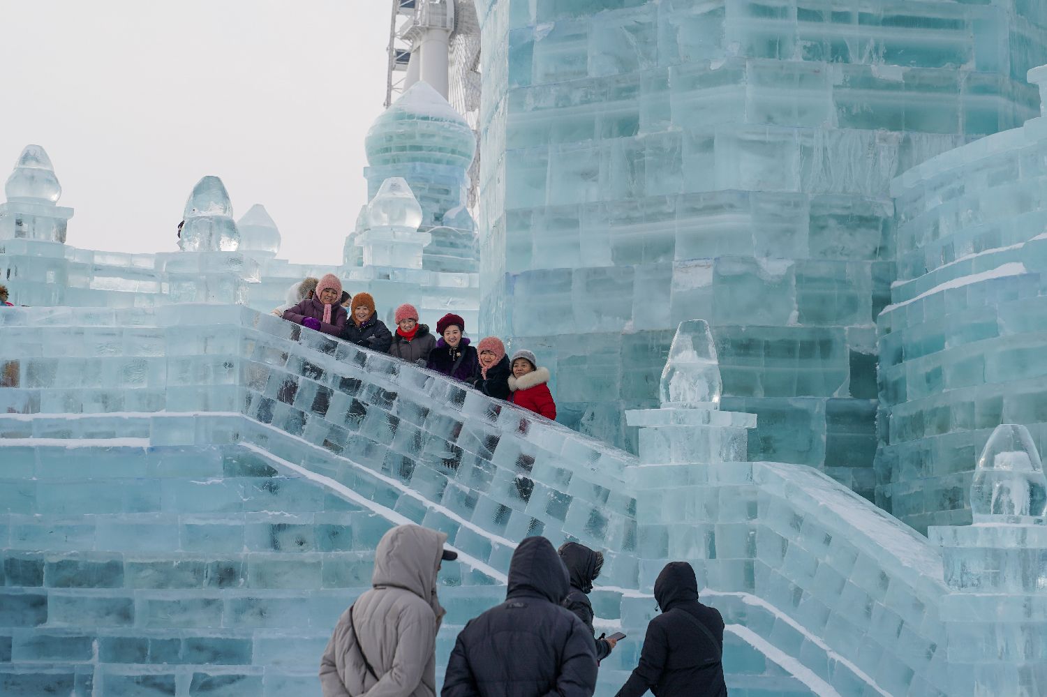 1月4日,第25届哈尔滨冰雪大世界内的冰雕吸引游客观看。白天的冰雪大世界,游客仿佛置身现实版“冰雪奇缘”。图为冰心筑梦景观区。(图片来源:中新社)