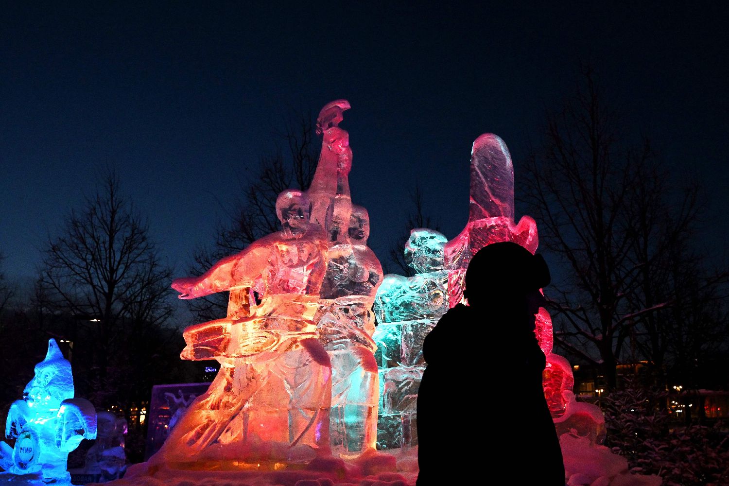 当地时间2024年1月7日,俄罗斯莫斯科,气温降至零下22摄氏度,莫斯科冰雕节期间,一名男子经过苏联著名雕像“工人与集体农庄女庄员”的冰雕。(图片来源:CFP)