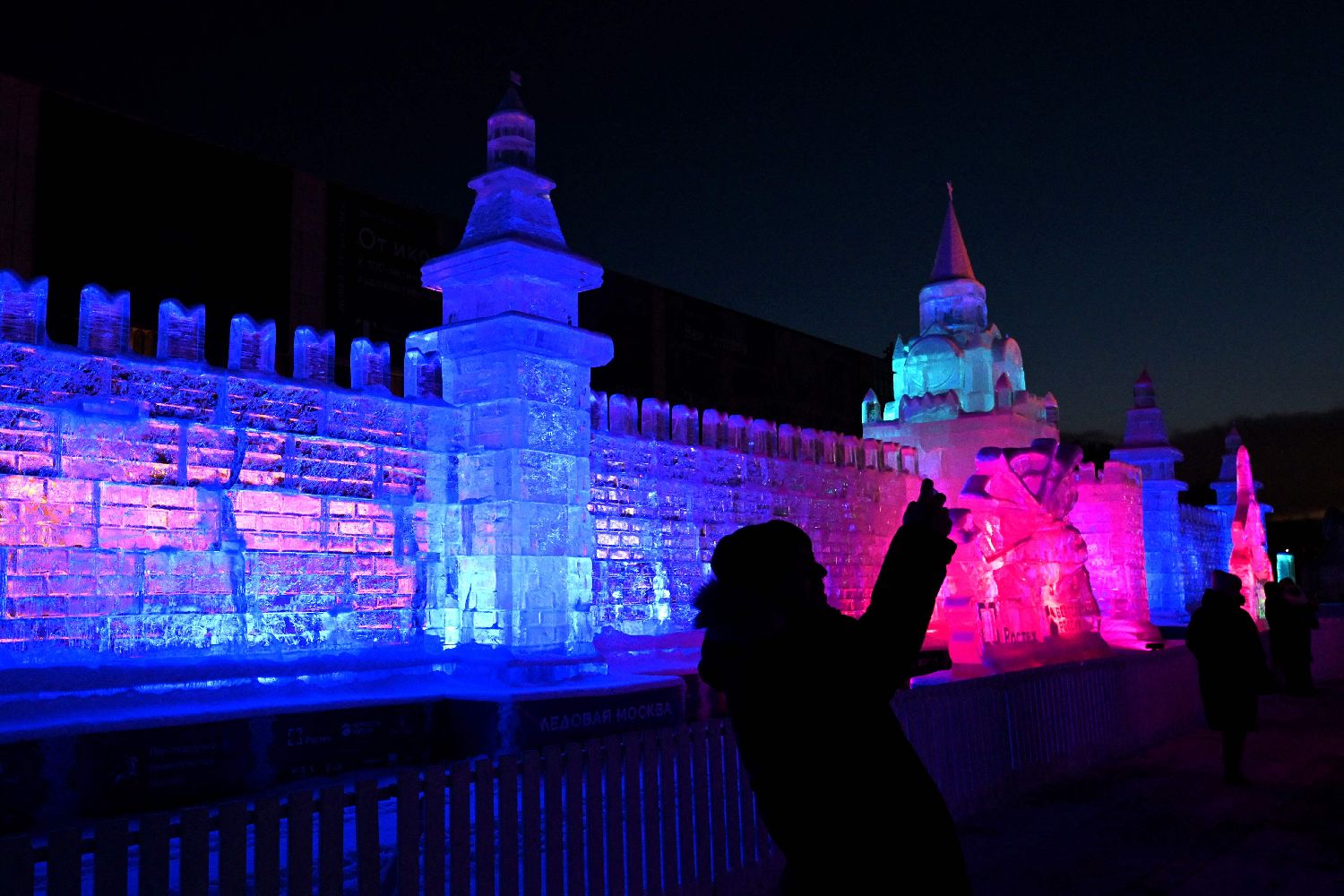 当地时间2024年1月7日,俄罗斯莫斯科,气温降至零下22摄氏度,莫斯科冰雕节期间,一名游客在克里姆林宫冰雕前自拍。(图片来源:CFP)