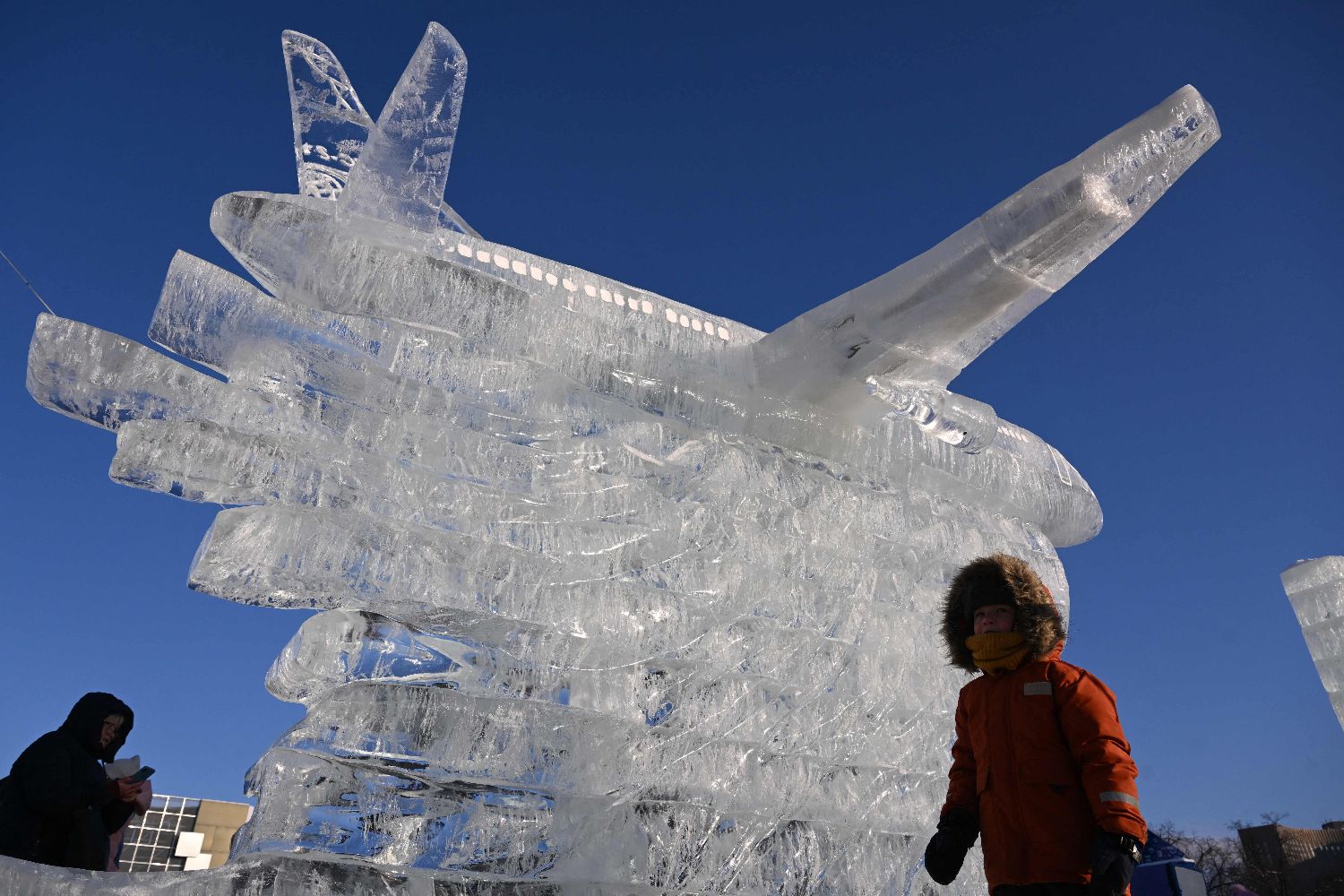 当地时间2024年1月7日,俄罗斯莫斯科,气温降至零下22摄氏度,全俄展览中心,一名儿童经过一架伊尔库特MC-21-300客机冰雕,当时气温降至零下22摄氏度。(图片来源:CFP)