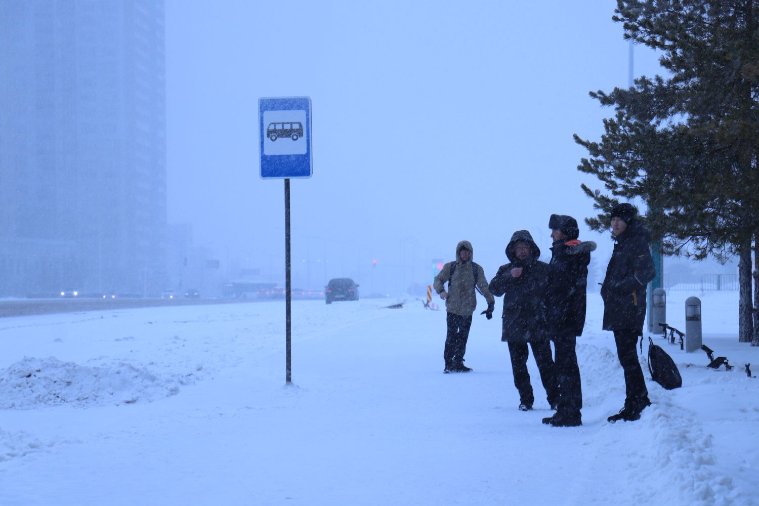 当地时间1月10日,哈萨克斯坦首都阿斯塔纳迎暴风雪天气。图为当地民众在站点等待公交车。(图片来源:中新社)