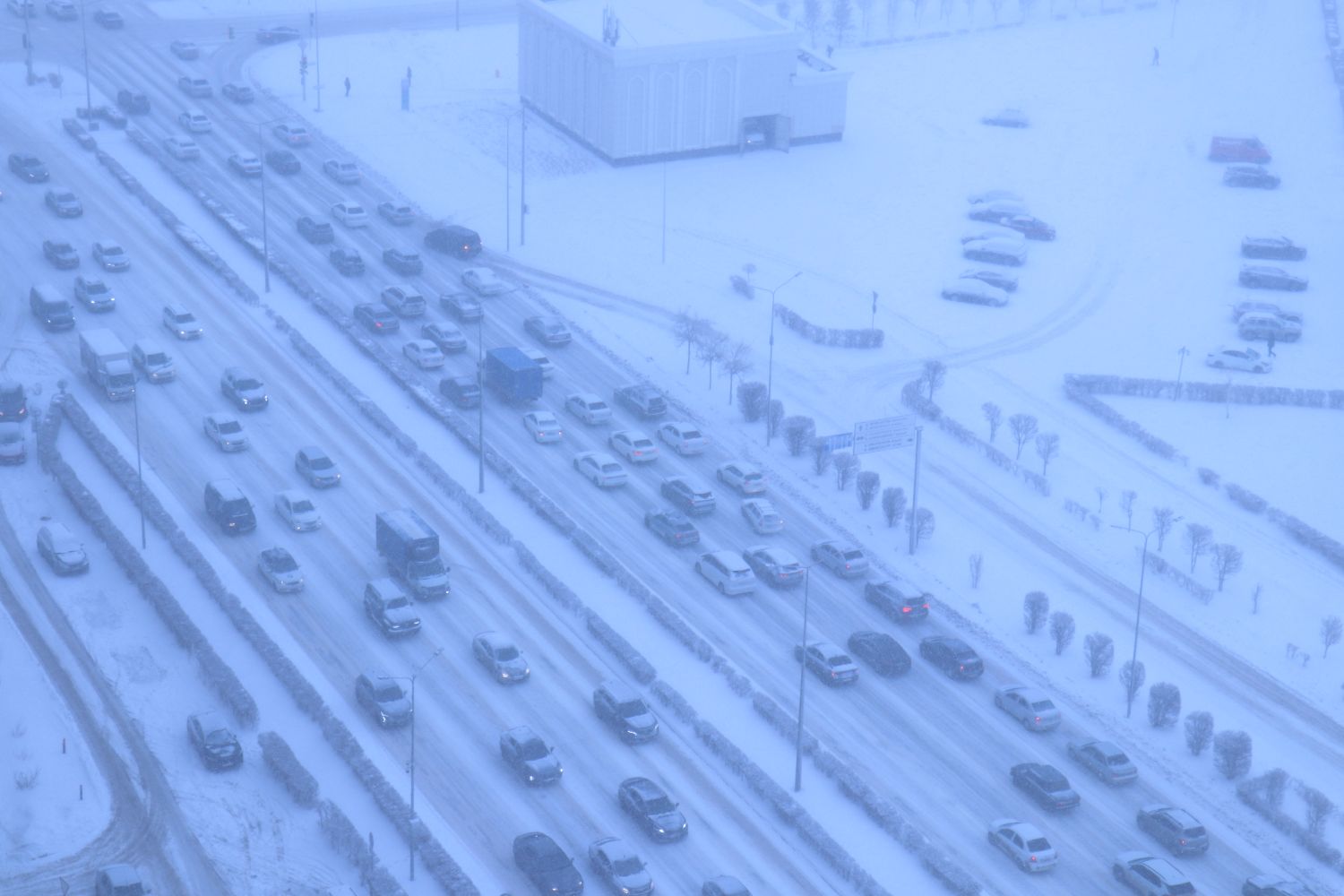 当地时间1月10日,哈萨克斯坦首都阿斯塔纳迎暴风雪天气,给行车及民众出行带来不便。图为城市道路车辆减速慢行。(图片来源:中新社)