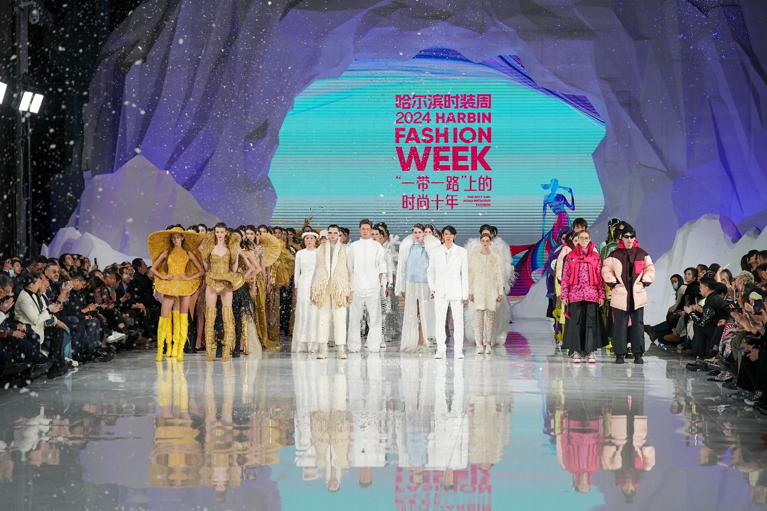 1月11日,2024第十届哈尔滨国际时装周启幕。本届时装周以“‘一带一路’上的时尚十年”为主题,将围绕“大秀、大会、签约、展览、节庆”五大活动板块,举办国际设计师发布秀、百大成衣品牌秀、龙江非遗文化秀演、世界时尚设计师沙龙等一系列创新活动。图为模特在时装周上展示服装。(图片来源:中新社)